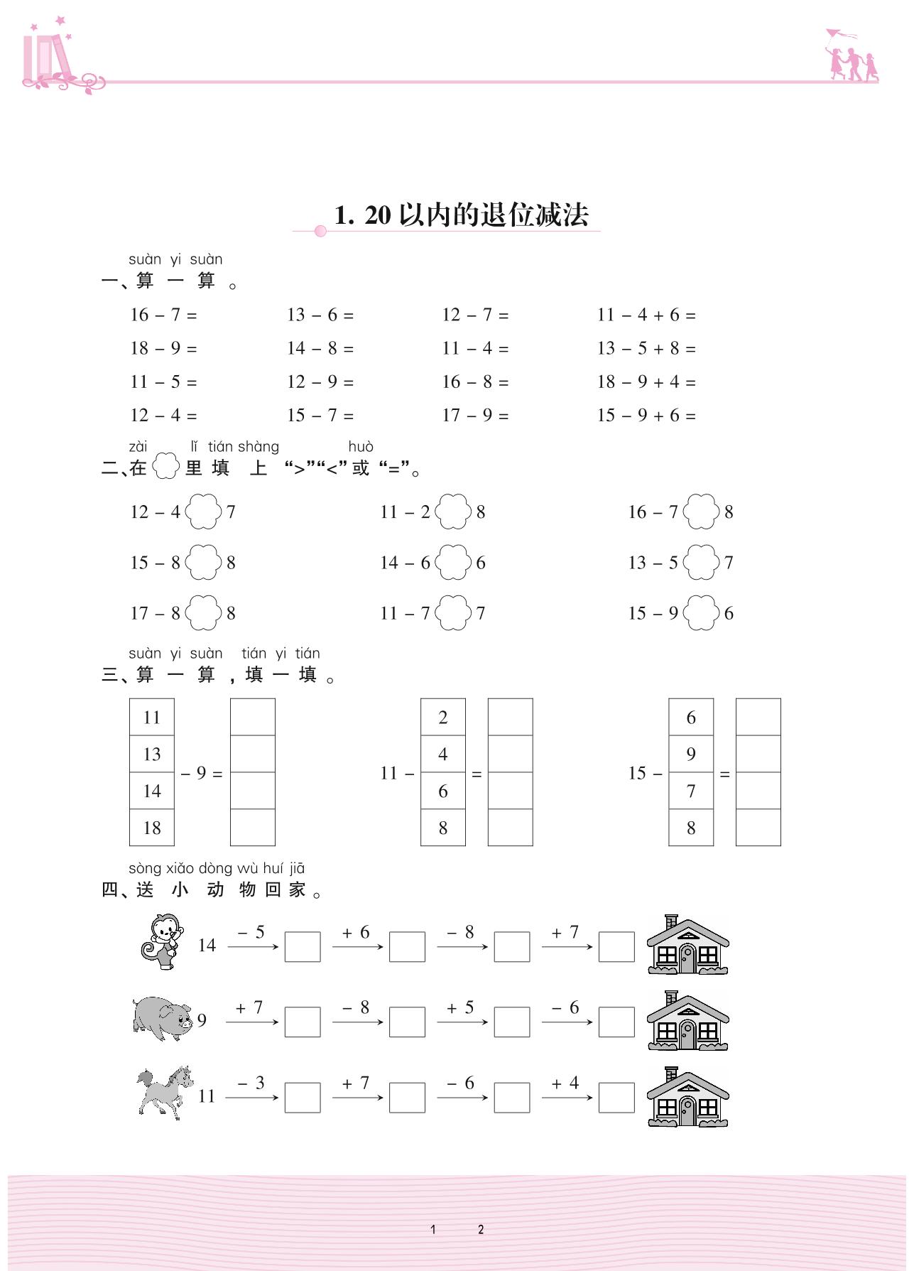 2021下册一年级数学苏教版 七 期末复习——1. 20以内的退位减法