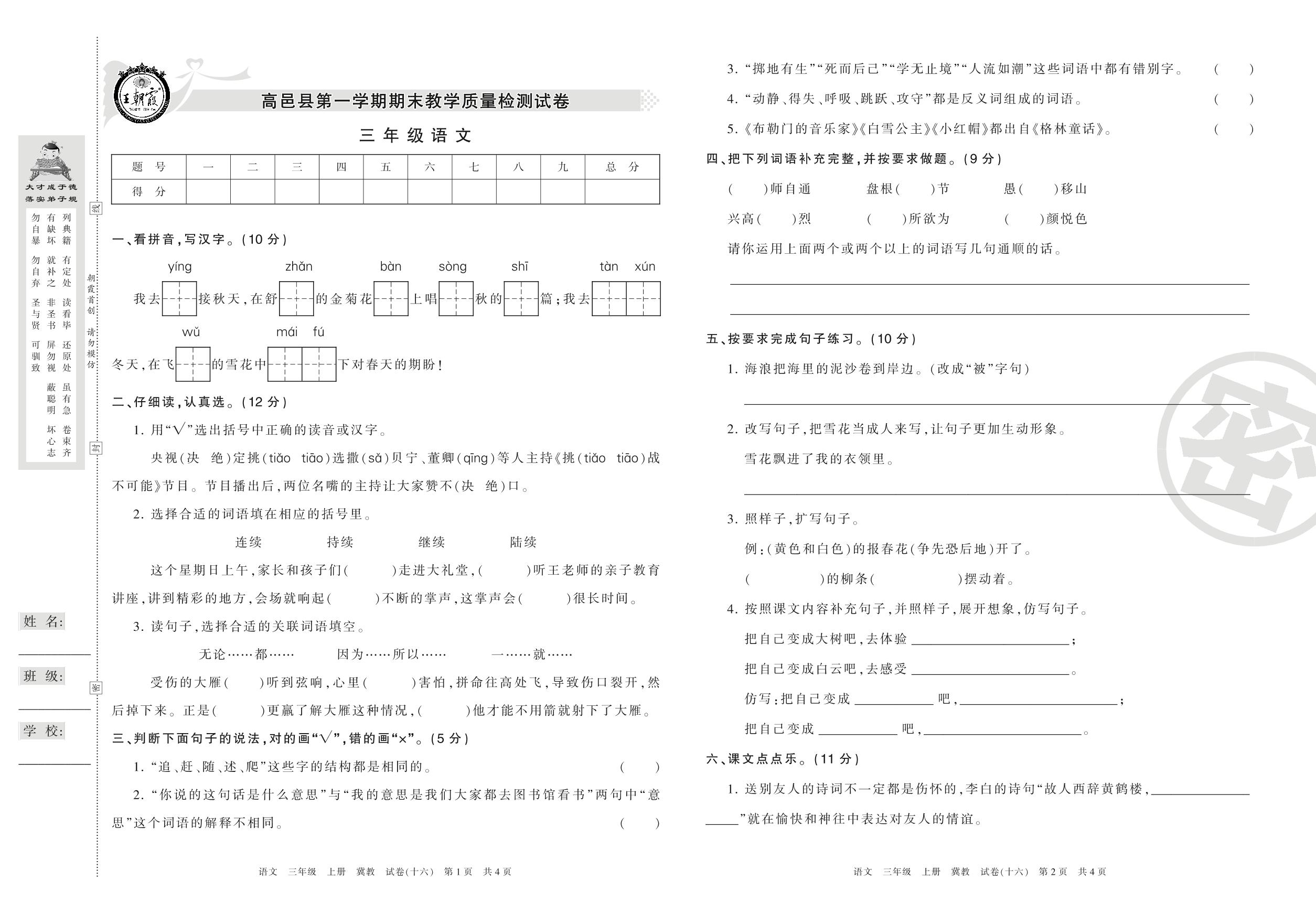 2016-2017学年第一学期石家庄市高邑县三年级语文试卷(冀教版)【16】