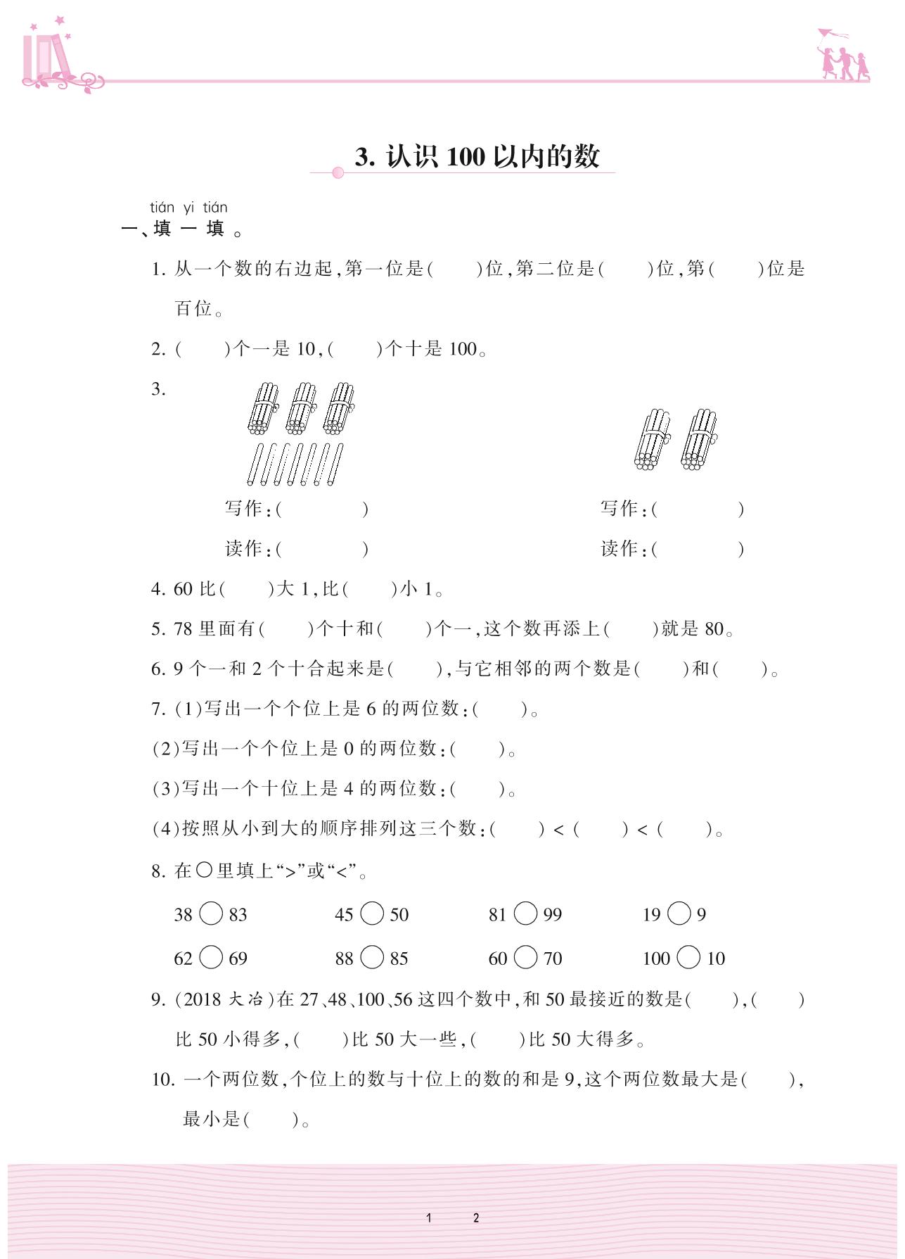 2021下册一年级数学苏教版 七 期末复习——3. 认识100以内的数