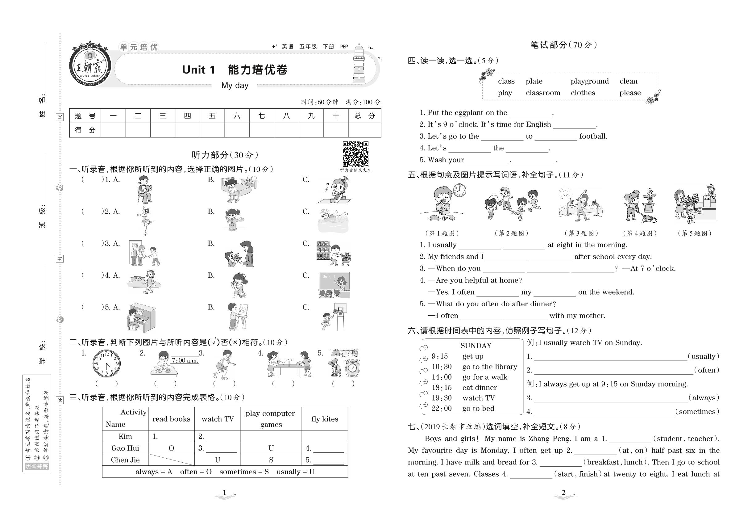 2021下册五年级英语PEP版 Unit 1 能力培优卷