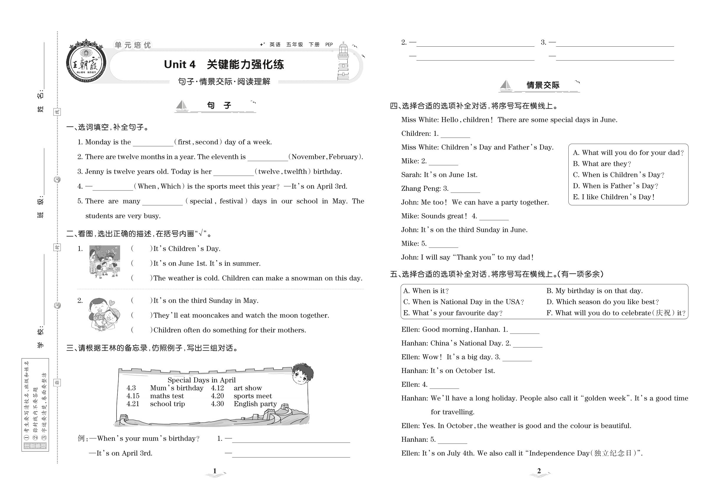 五年级英语人教PEP版(三起始)下册单元卷