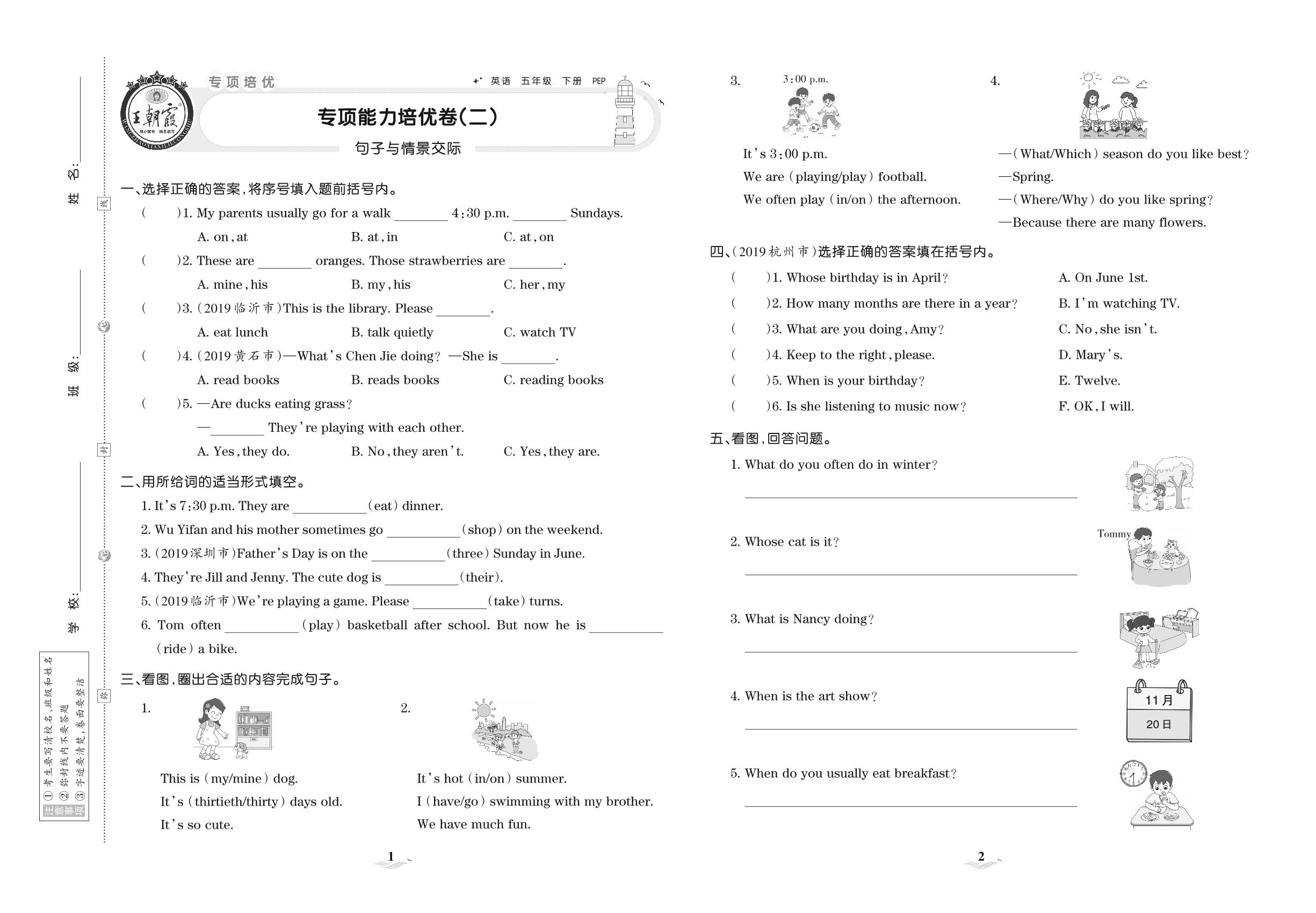 2021下册五年级英语PEP版 专项能力培优卷(二) 句子与情景交际