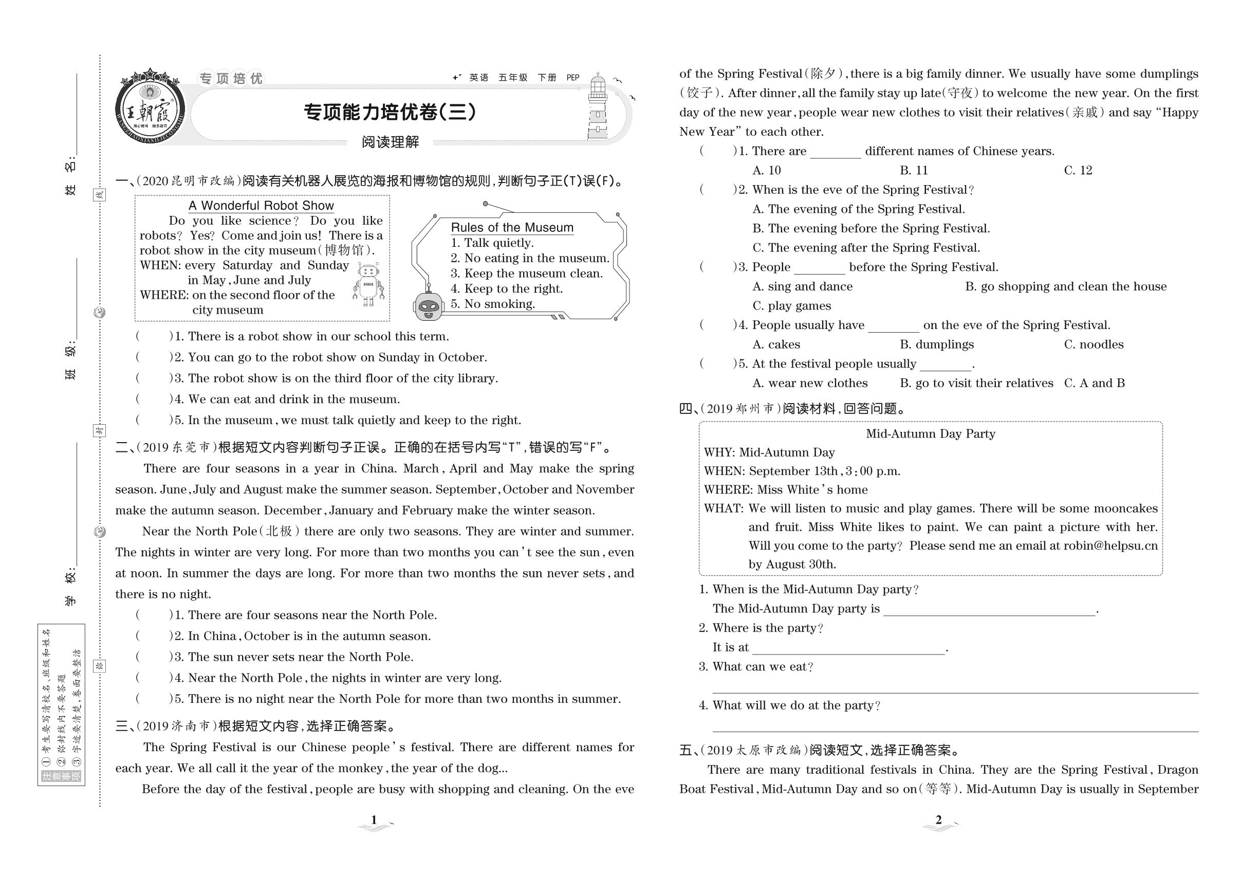 2021下册五年级英语PEP版 专项能力培优卷(三) 阅读理解