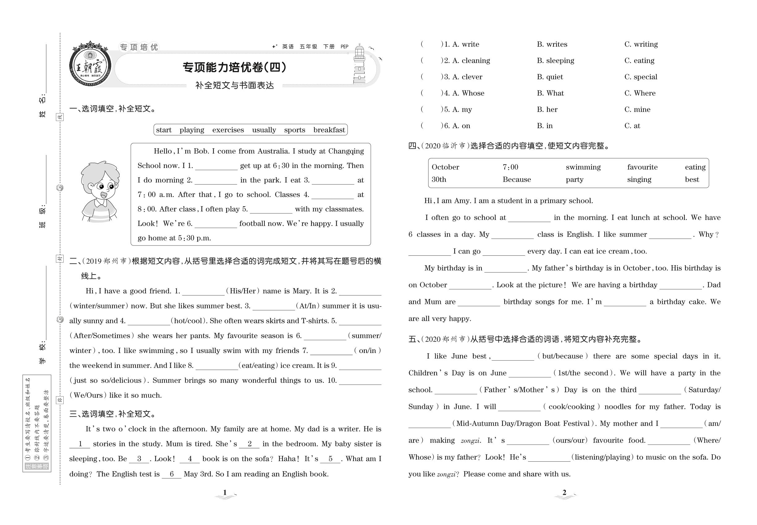 2021下册五年级英语PEP版 专项能力培优卷(四) 补全短文与书面表达