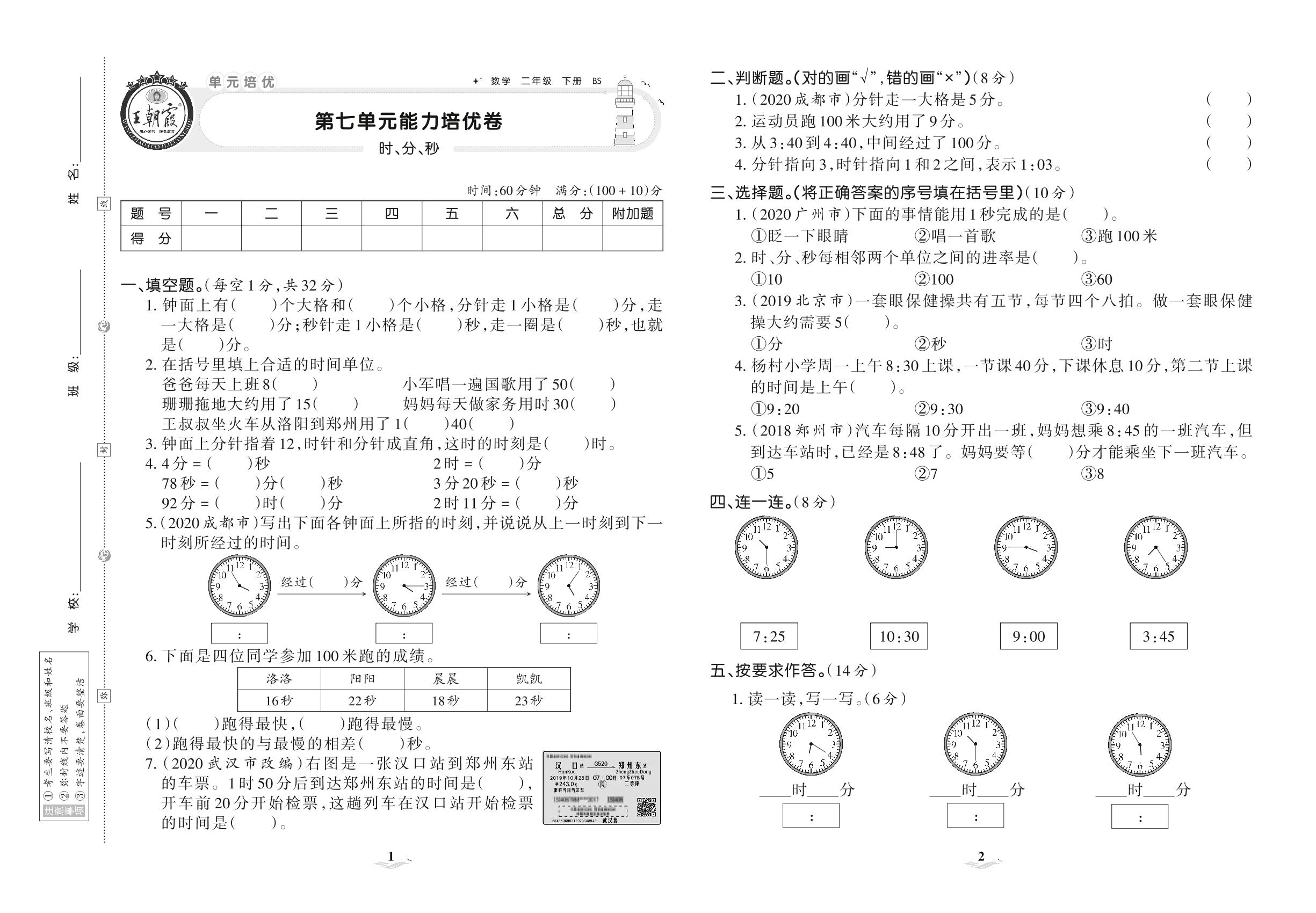 2021下册二年级数学北师版 第七单元 能力培优卷