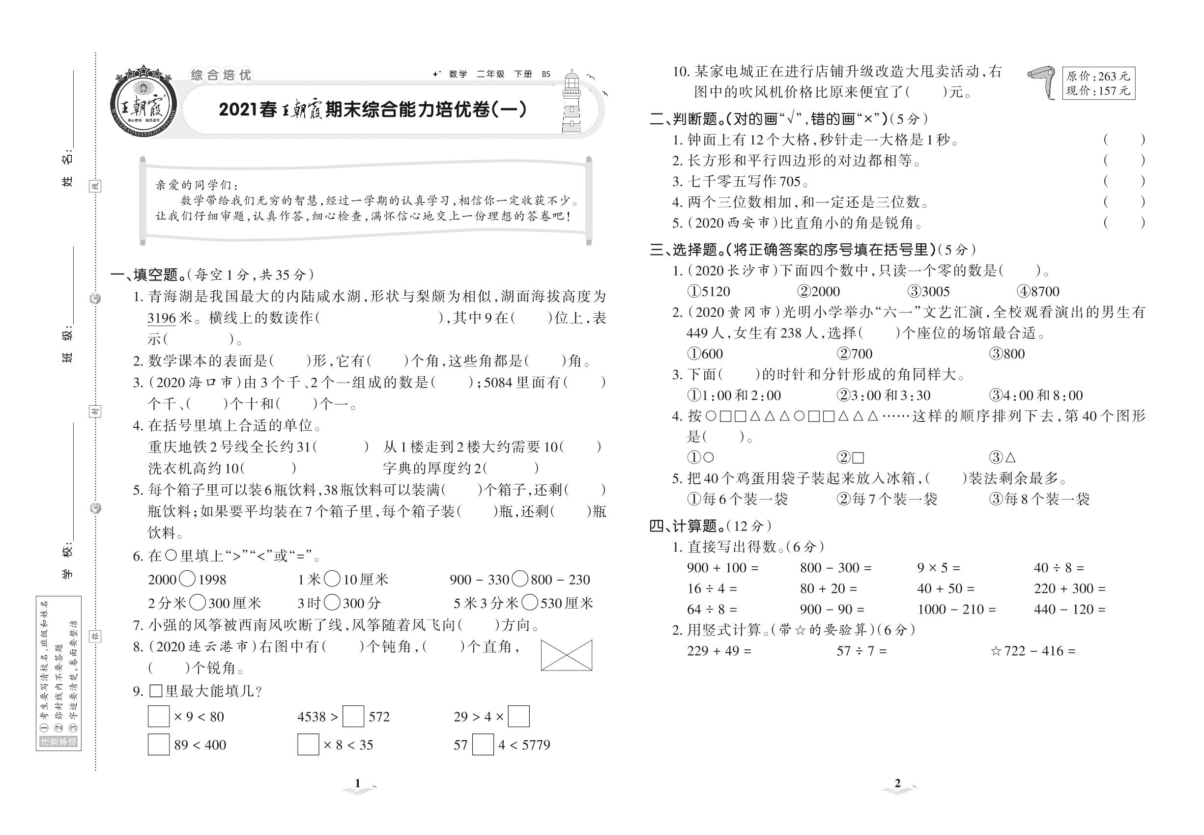2021下册二年级数学北师版 王朝霞期末综合能力培优卷(一)