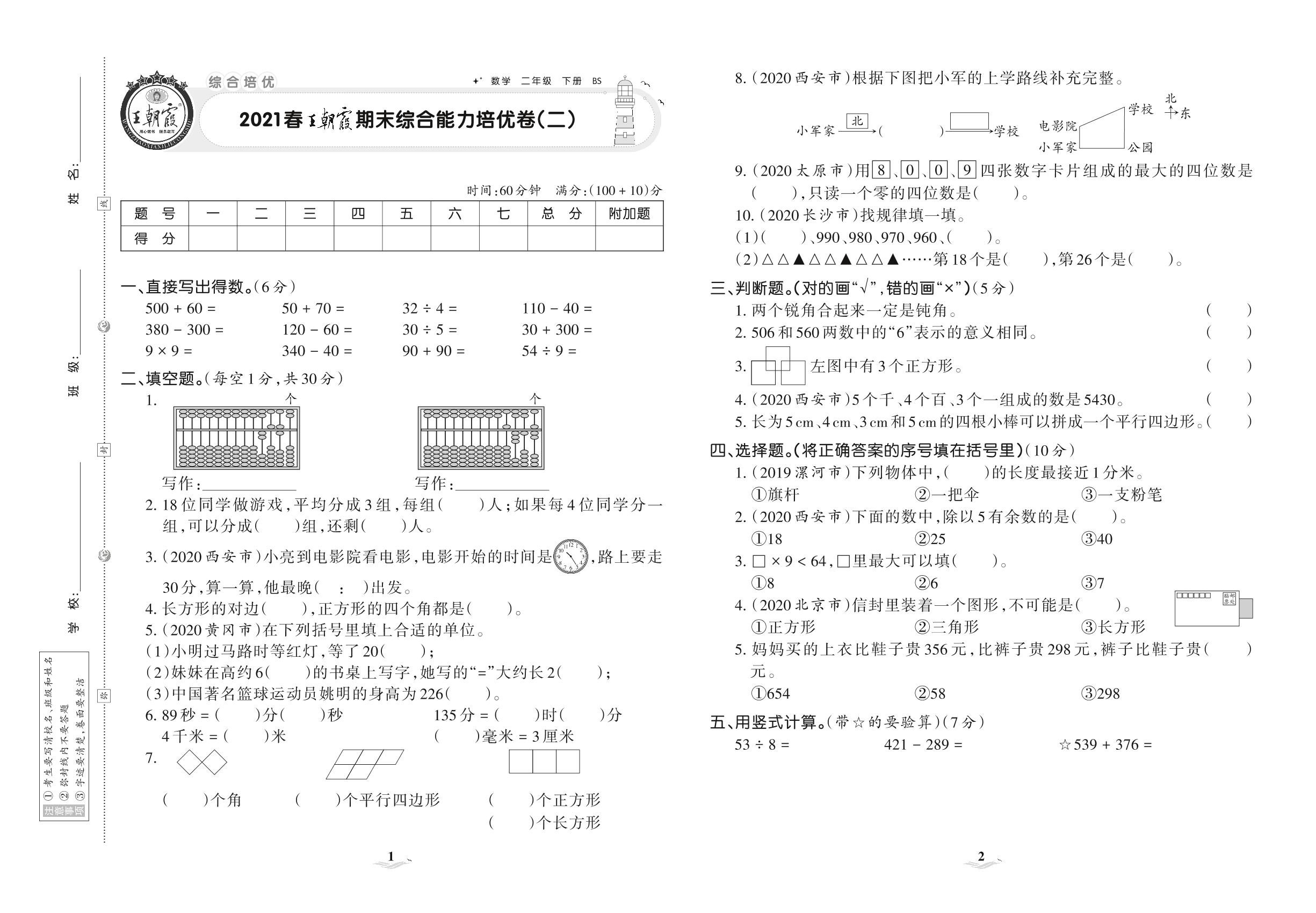 2021下册二年级数学北师版 王朝霞期末综合能力培优卷(二)