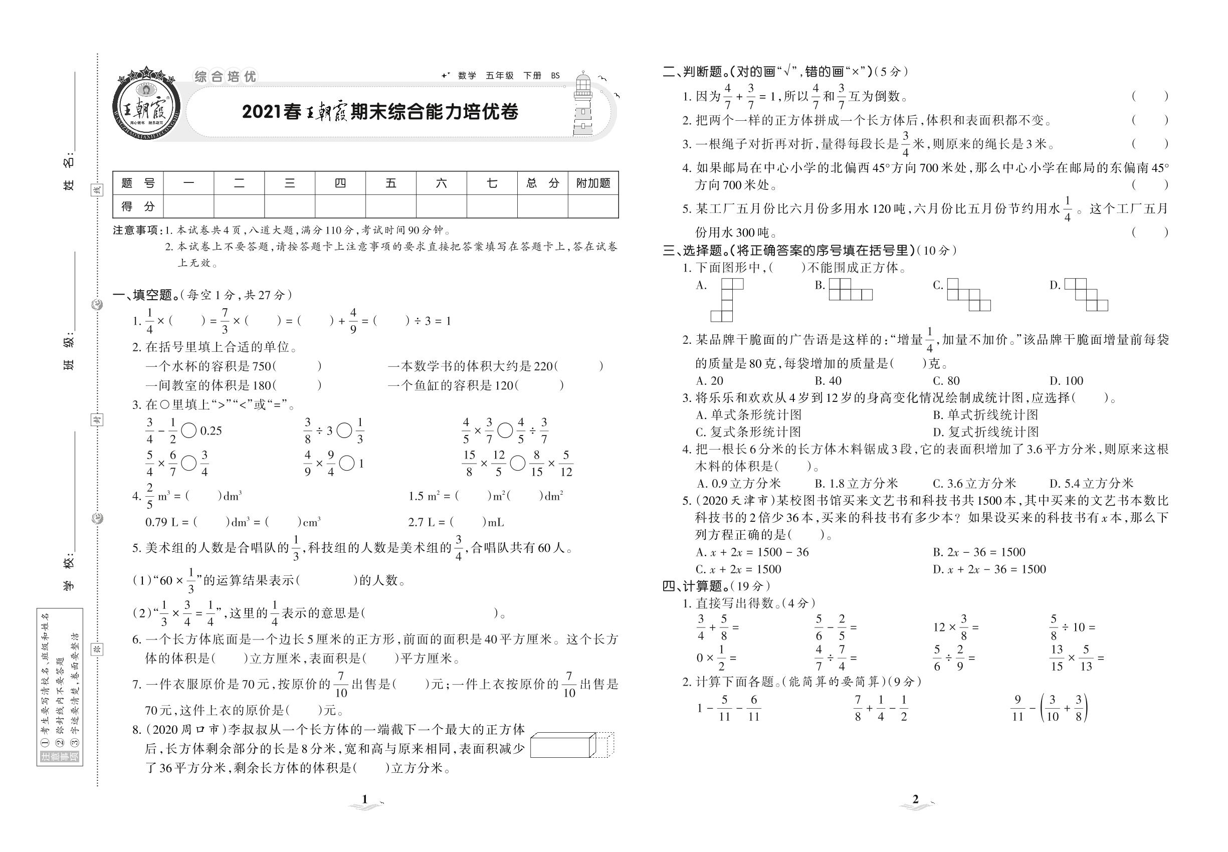 2021下册五年级数学北师版 王朝霞期末综合能力培优卷