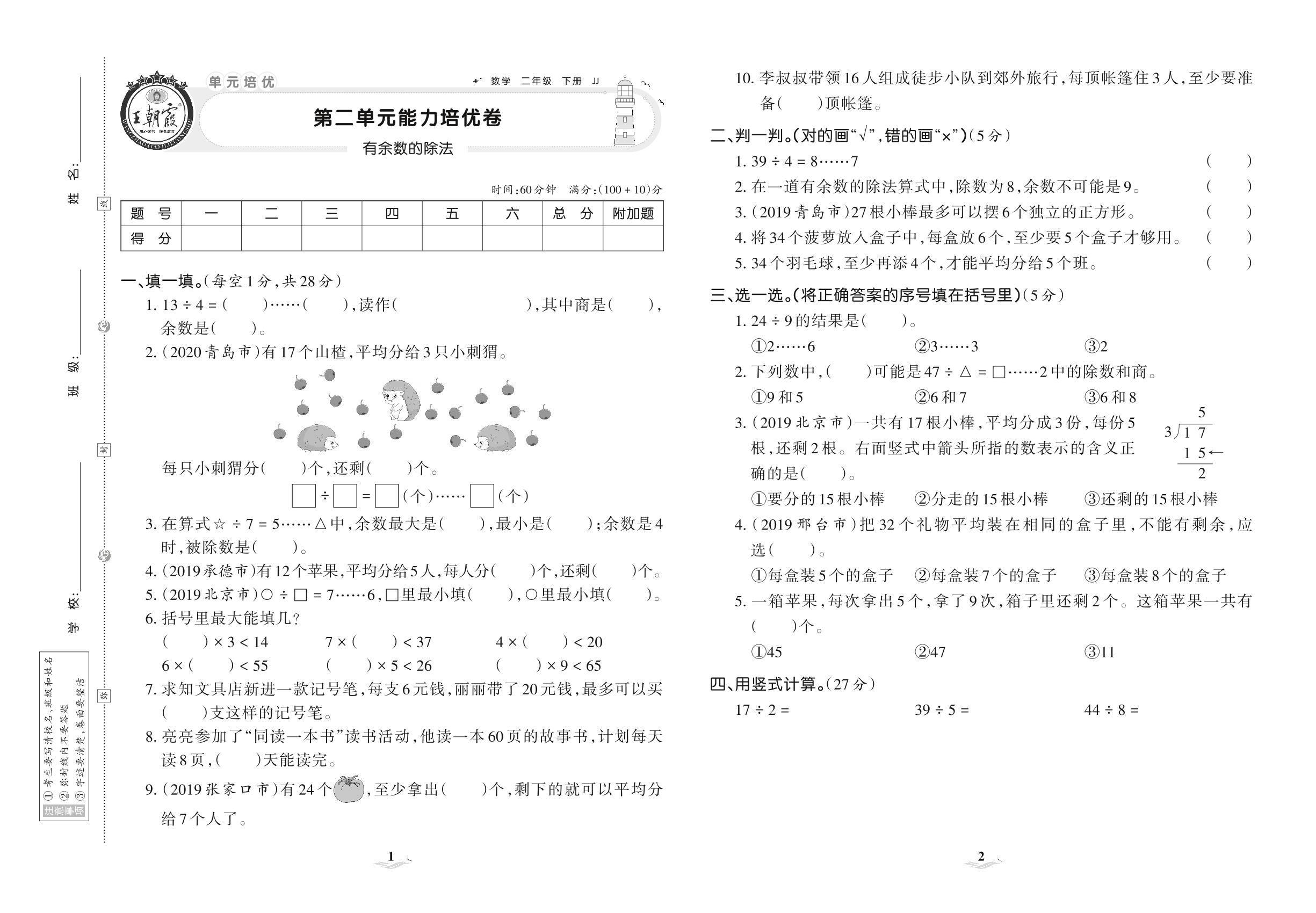 2021下册二年级数学冀教版 第二单元 能力培优卷