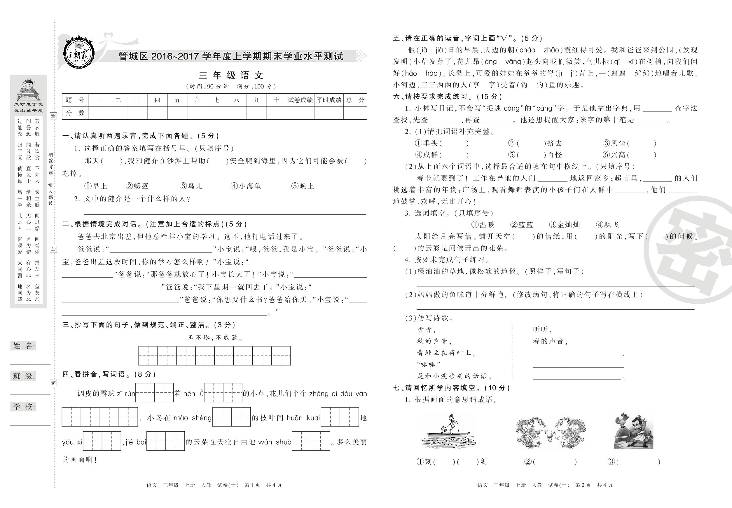 2016-2017学年第一学期郑州市管城区三年级语文试卷(人教版)【10】