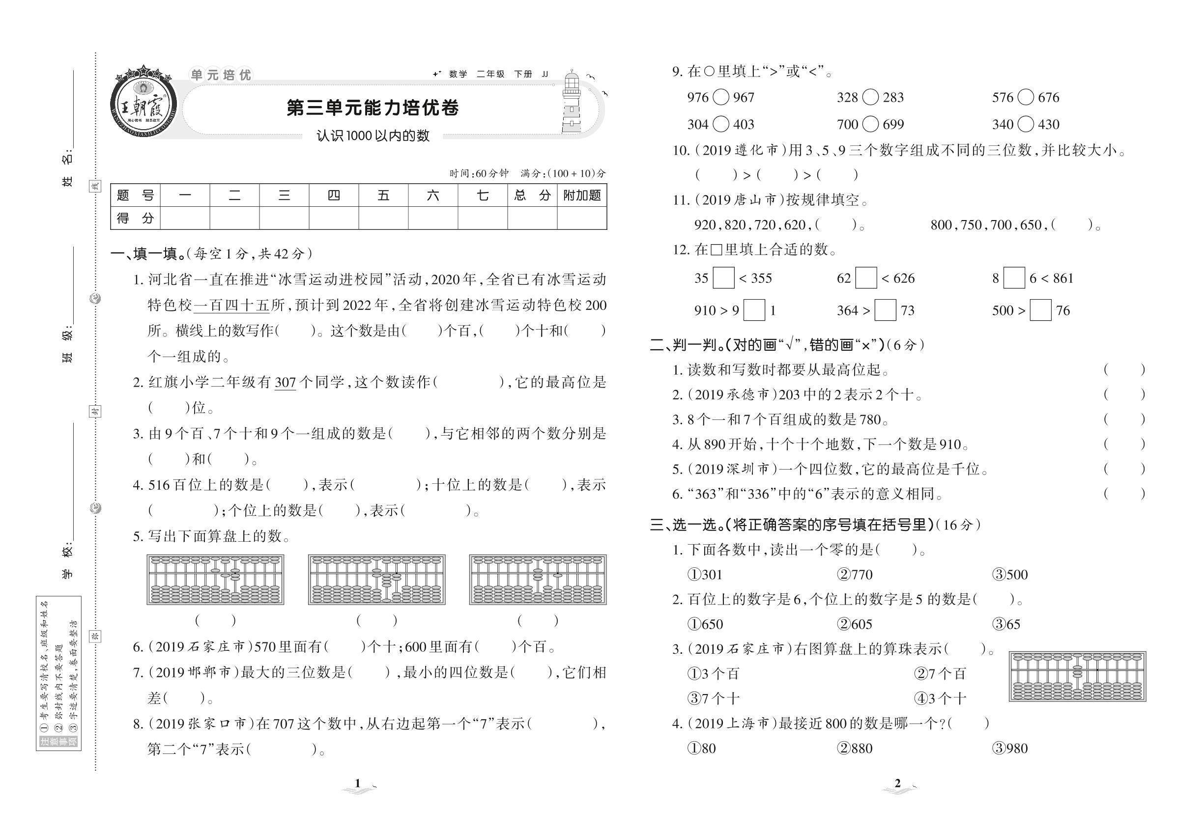 2021下册二年级数学冀教版 第三单元 能力培优卷