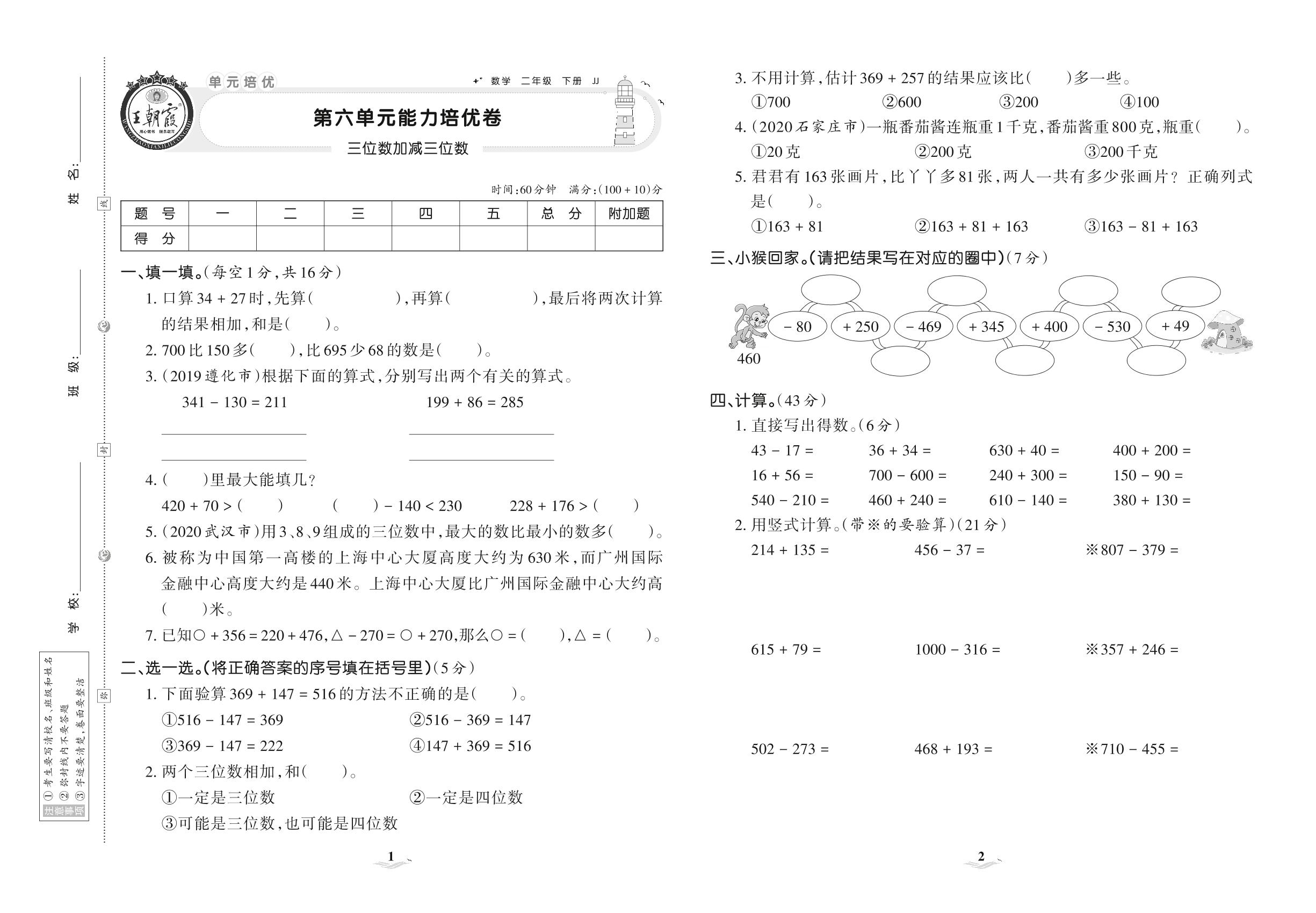 2021下册二年级数学冀教版 第六单元 能力培优卷