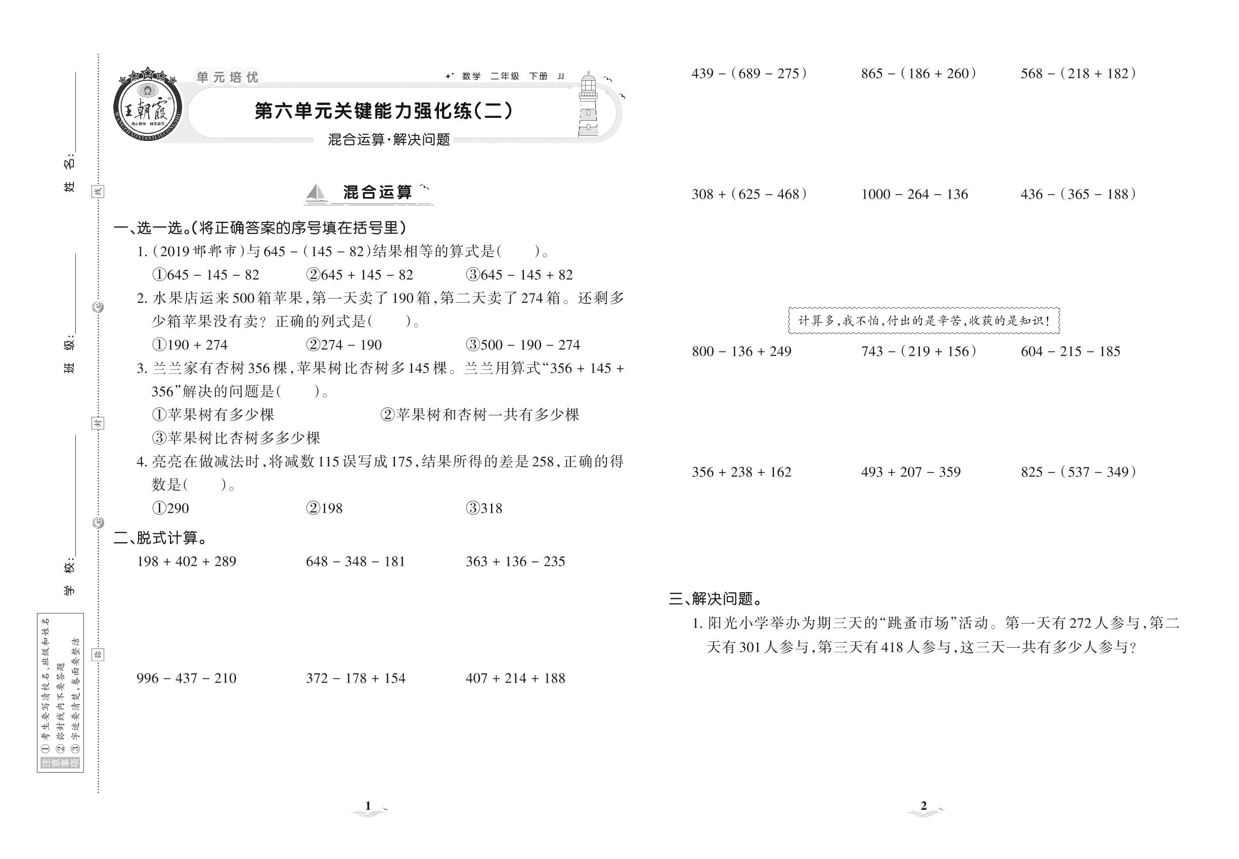 2021下册二年级数学冀教版 第六单元 关键能力强化练(二)