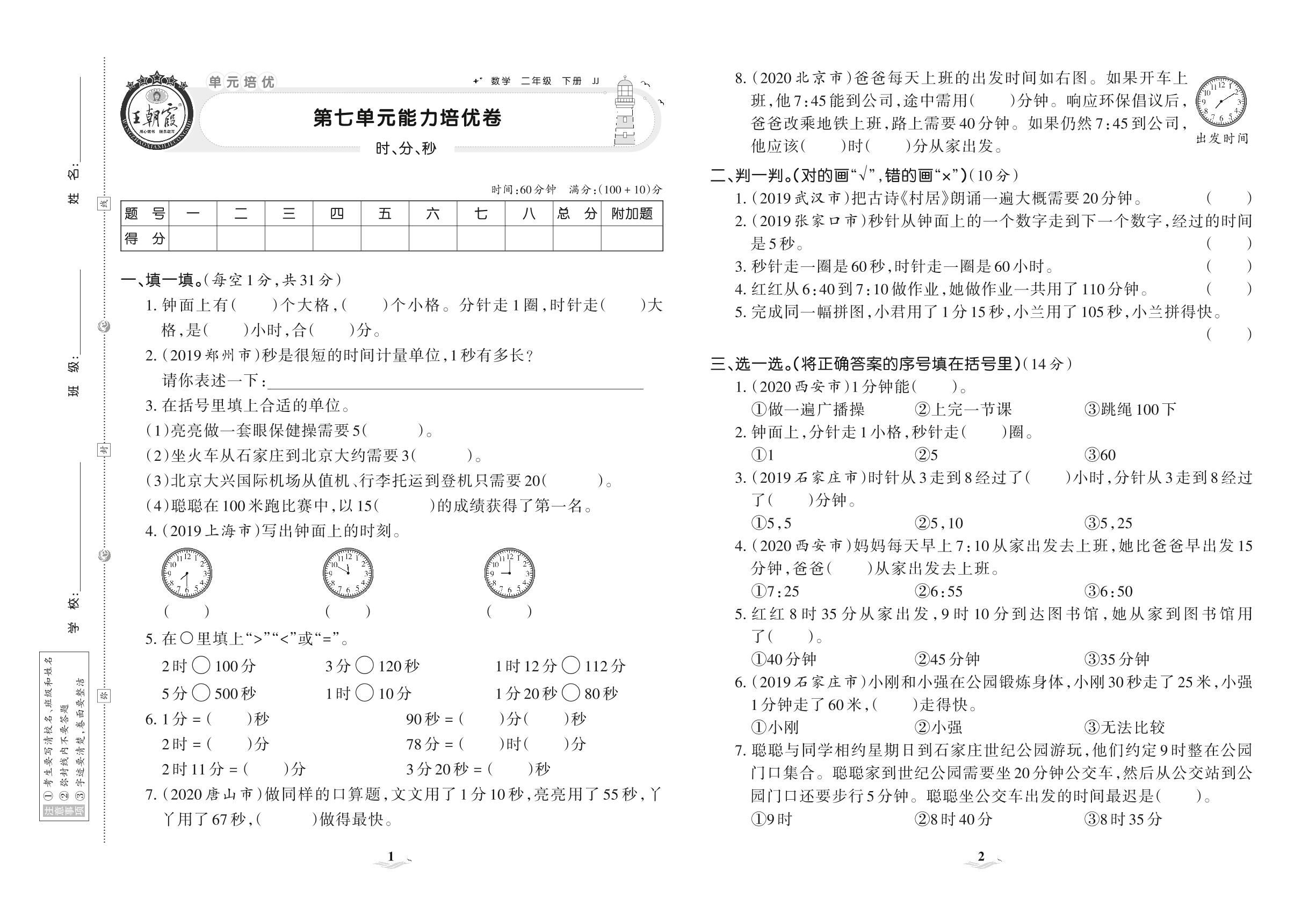 2021下册二年级数学冀教版 第七单元 能力培优卷