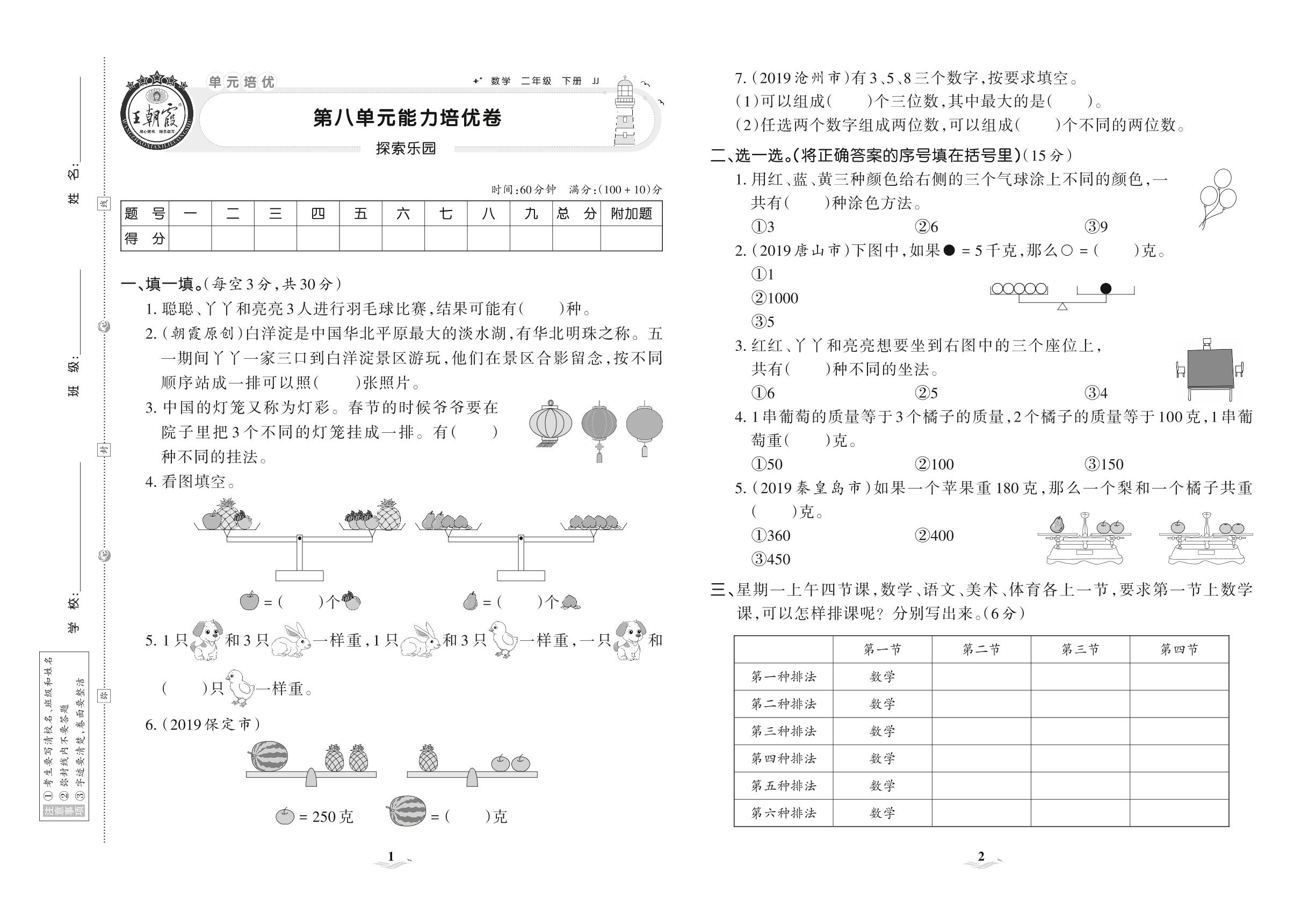 2021下册二年级数学冀教版 第八单元 能力培优卷
