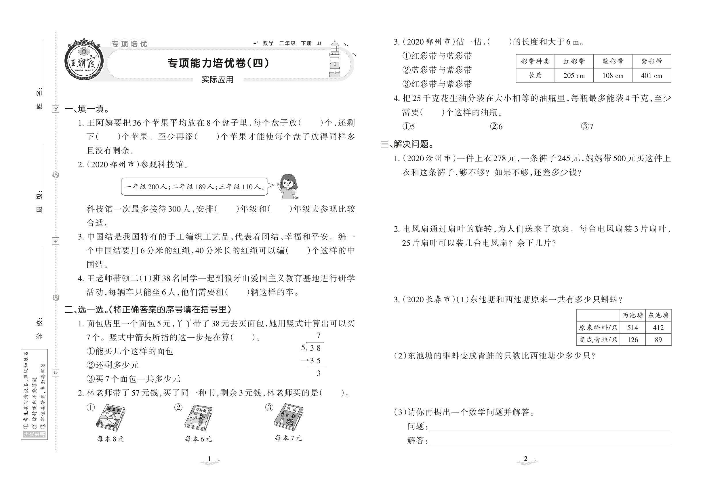 2021下册二年级数学冀教版 专项能力培优卷(四) 实际应用