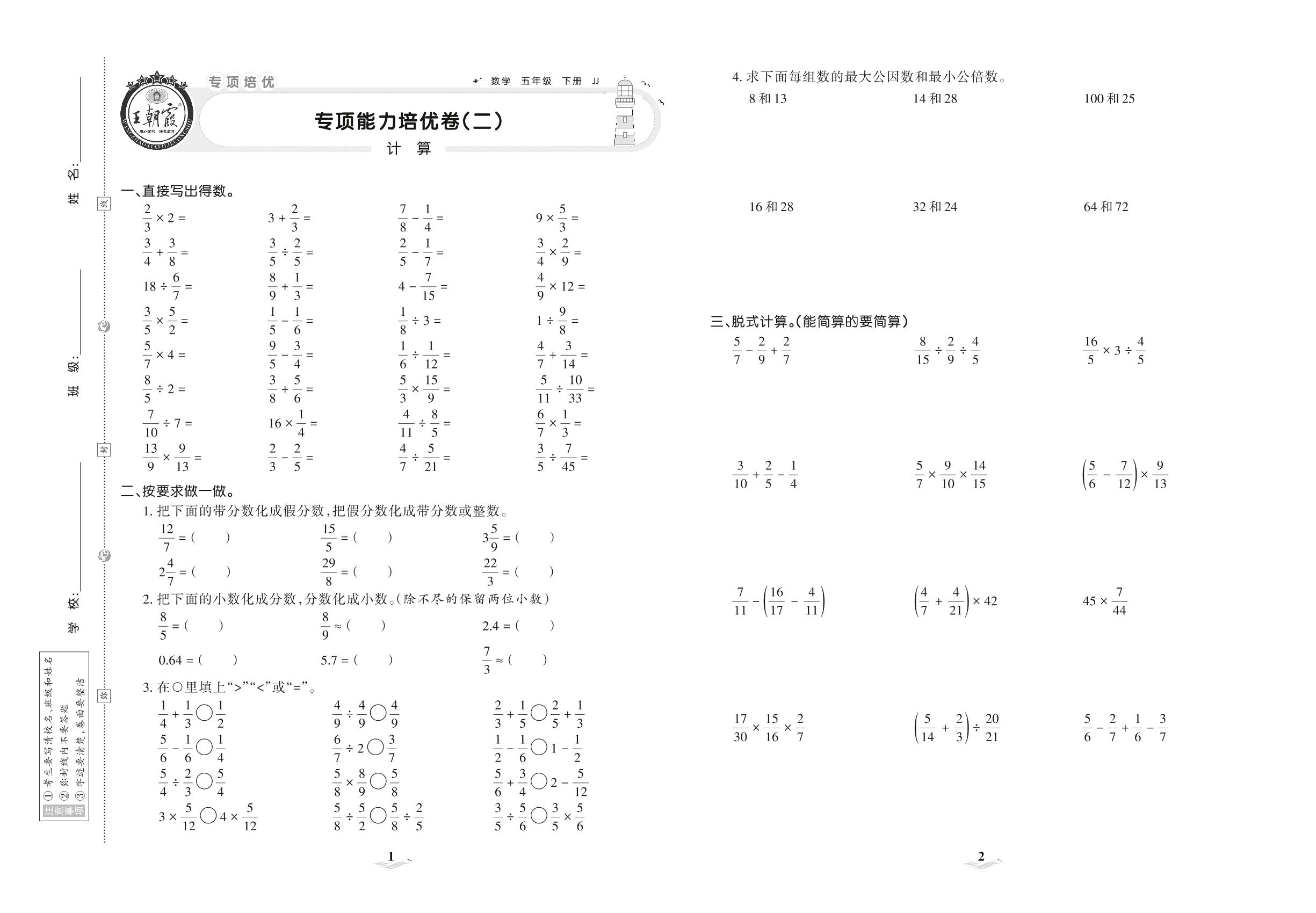 2021下册五年级数学冀教版 专项能力培优卷(二) 计算
