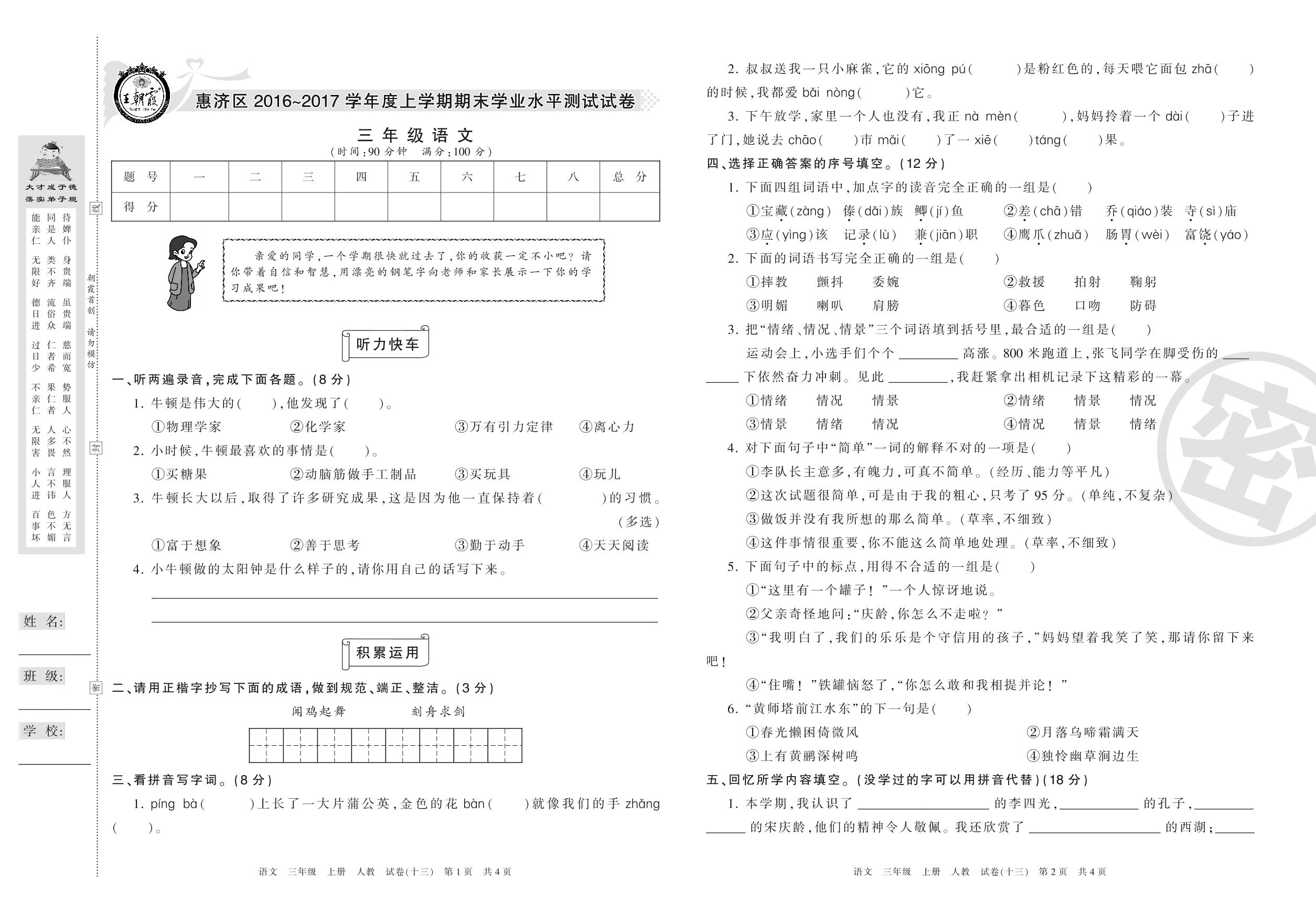 2016-2017学年第一学期郑州市惠济区三年级语文试卷(人教版)【13】