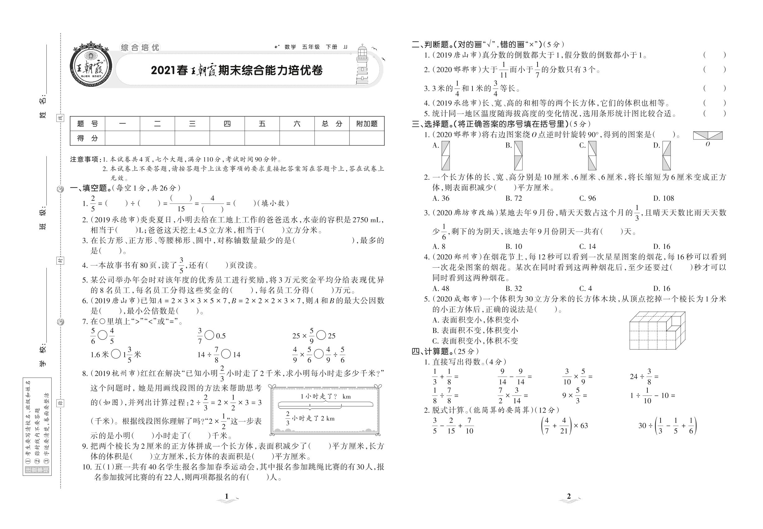 2021下册五年级数学冀教版 王朝霞期末综合能力培优卷