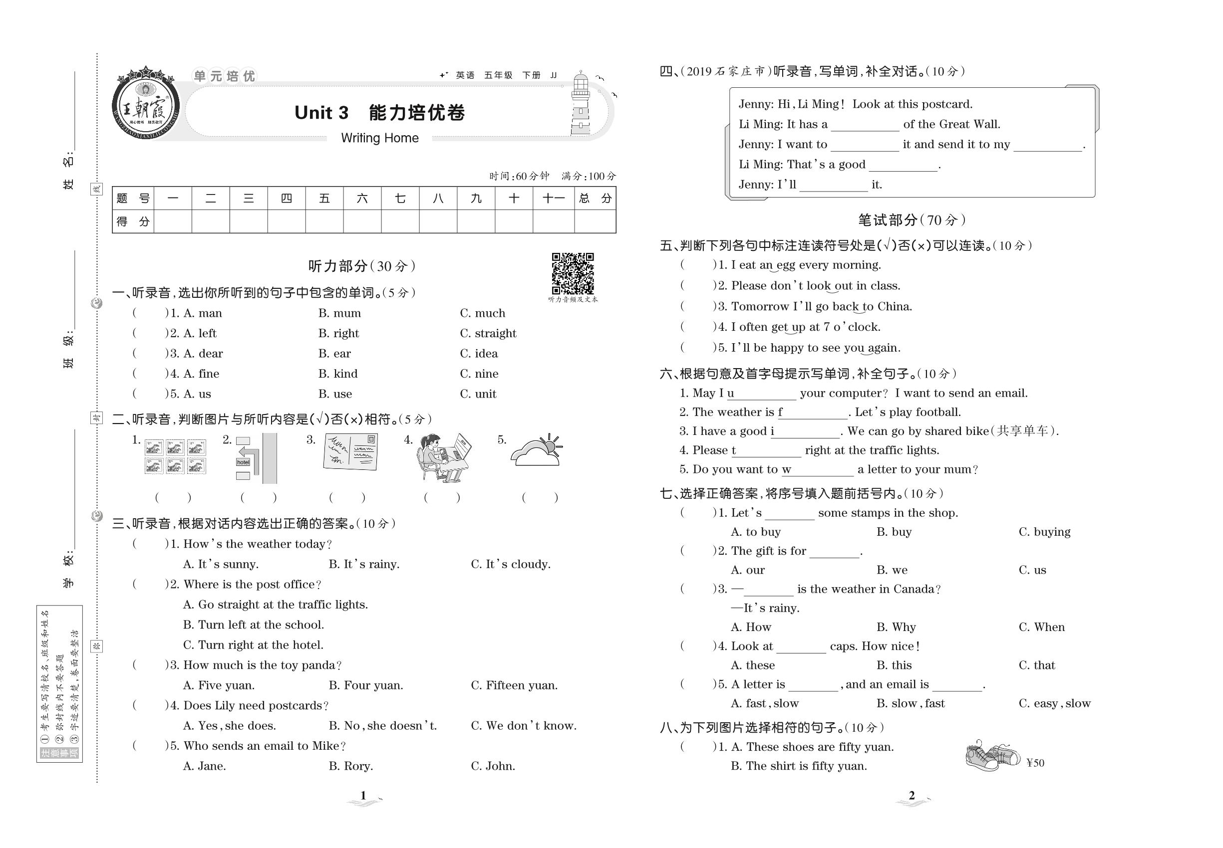 2021下册五年级英语冀教版 Unit 3 能力培优卷