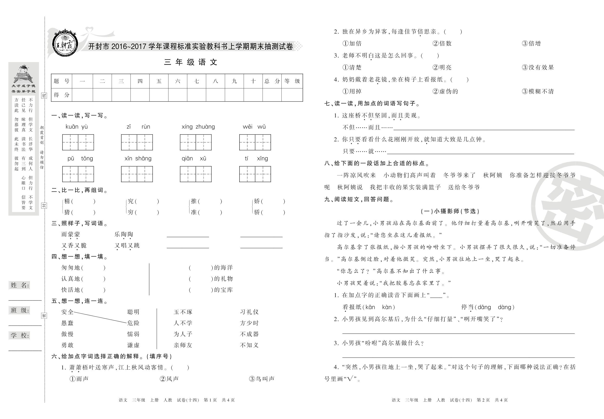 2016-2017学年第一学期开封市三年级语文试卷(人教版)【14】