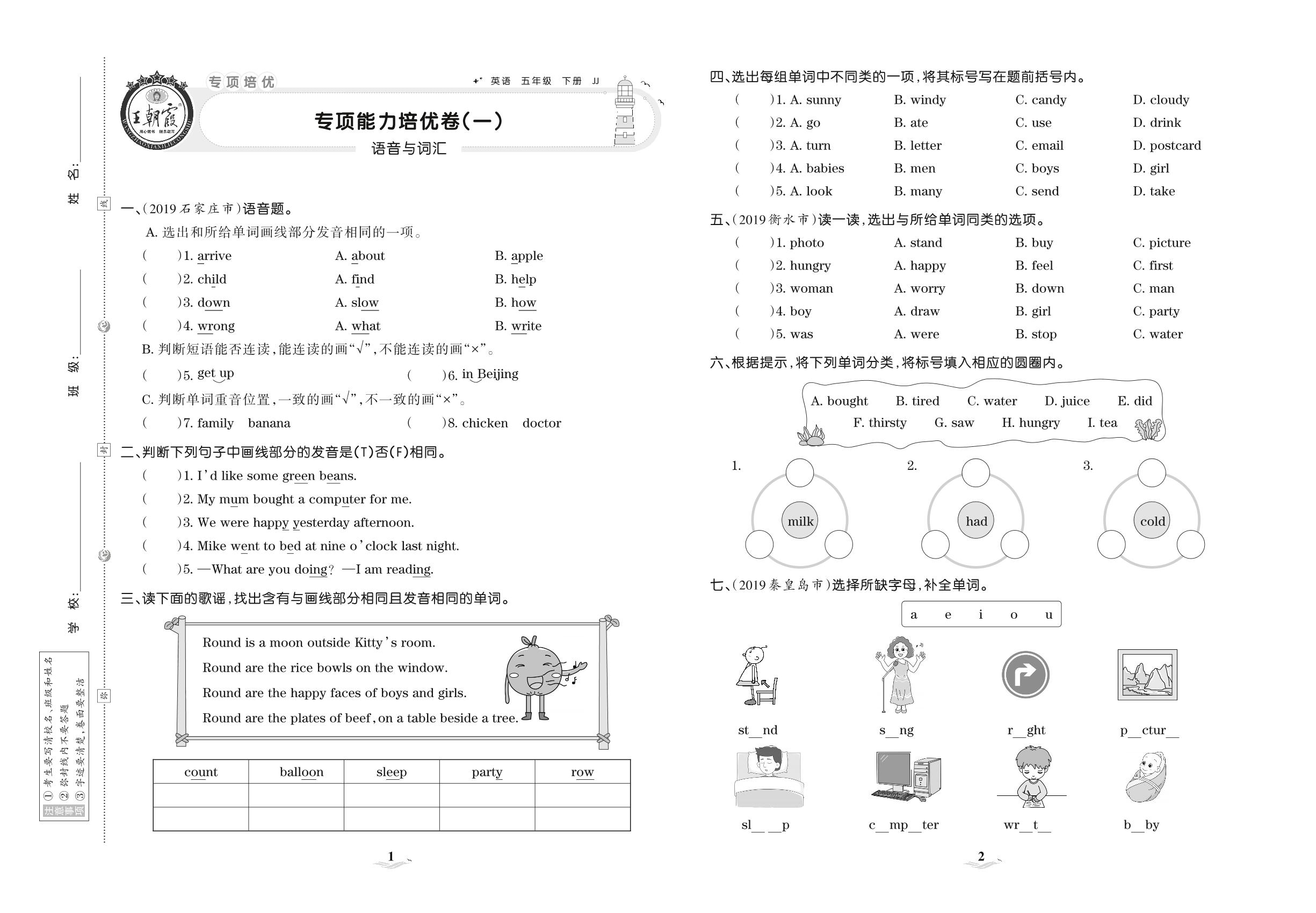 2021下册五年级英语冀教版 专项能力培优卷(一) 语音与词汇