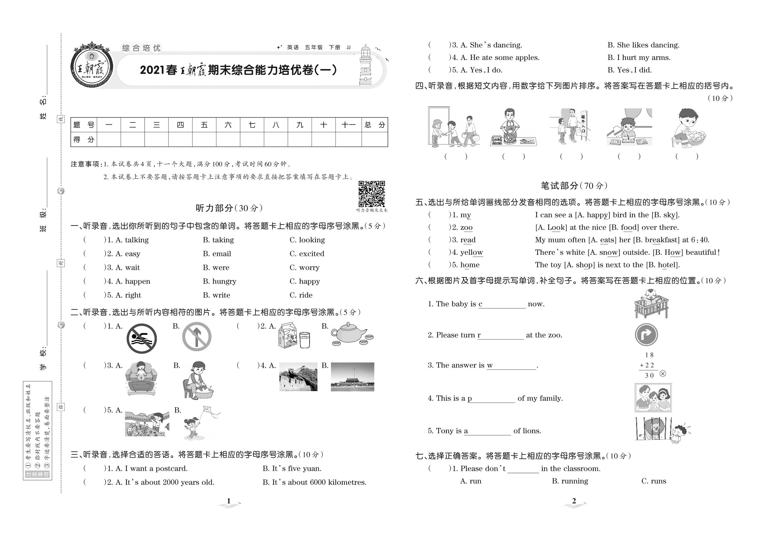 2021下册五年级英语冀教版 王朝霞期末综合能力培优卷(一)