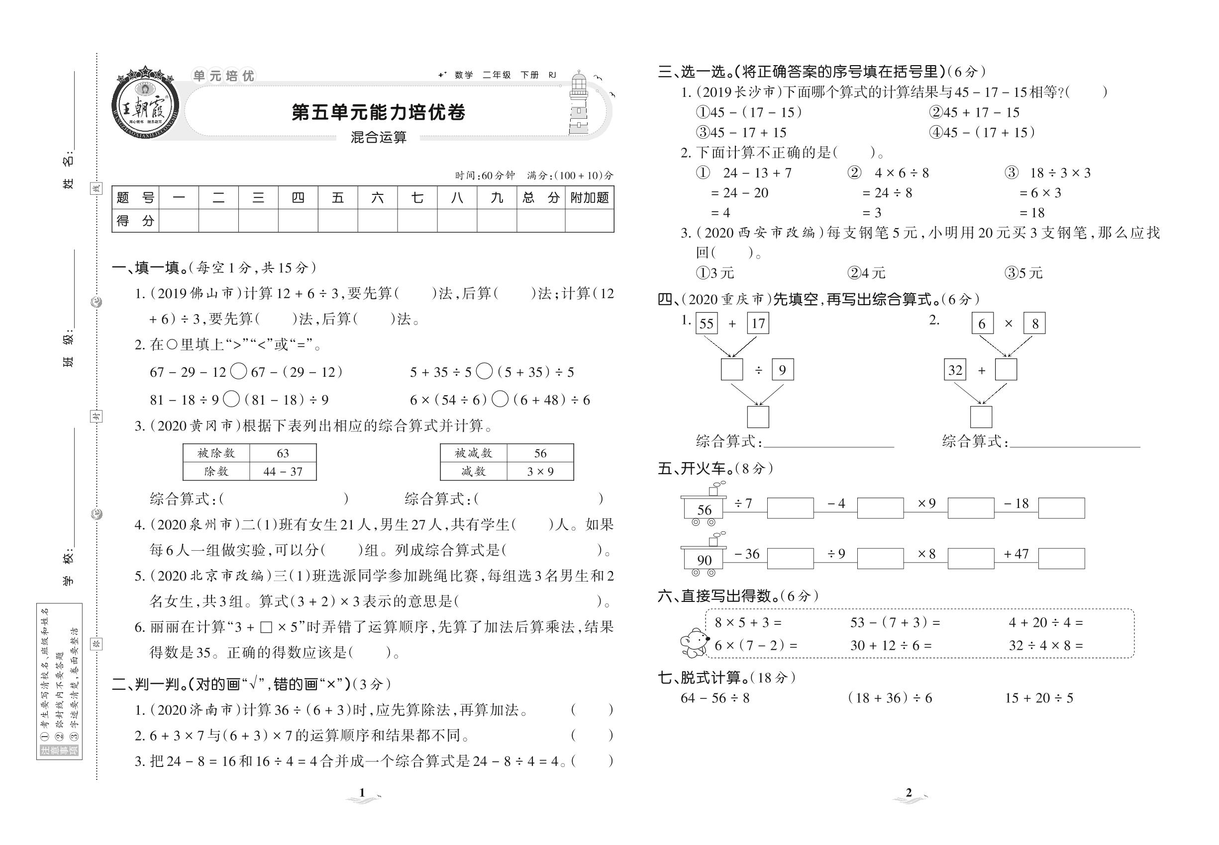 2021下册二年级数学人教版 第五单元 能力培优卷