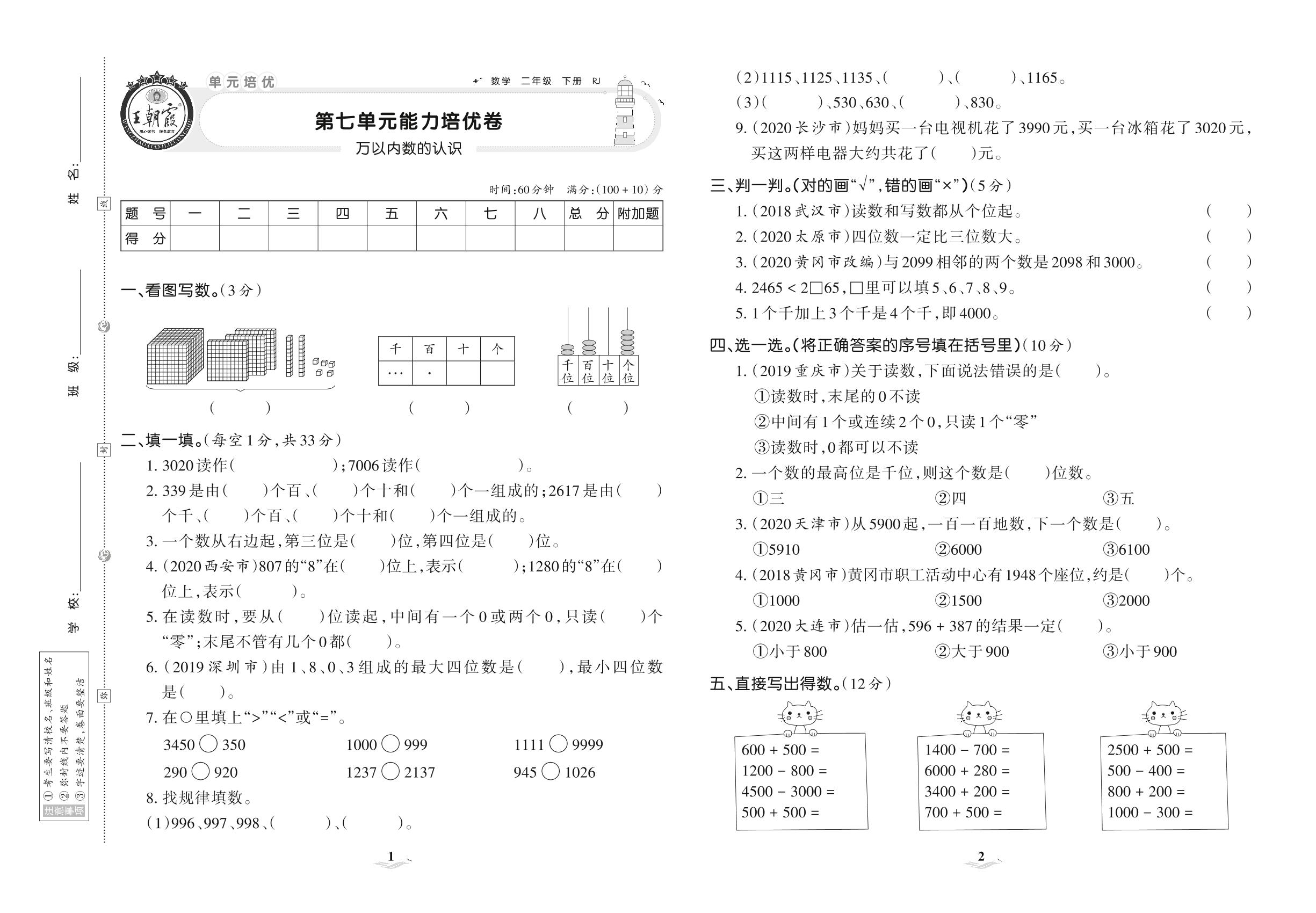 2021下册二年级数学人教版 第七单元 能力培优卷