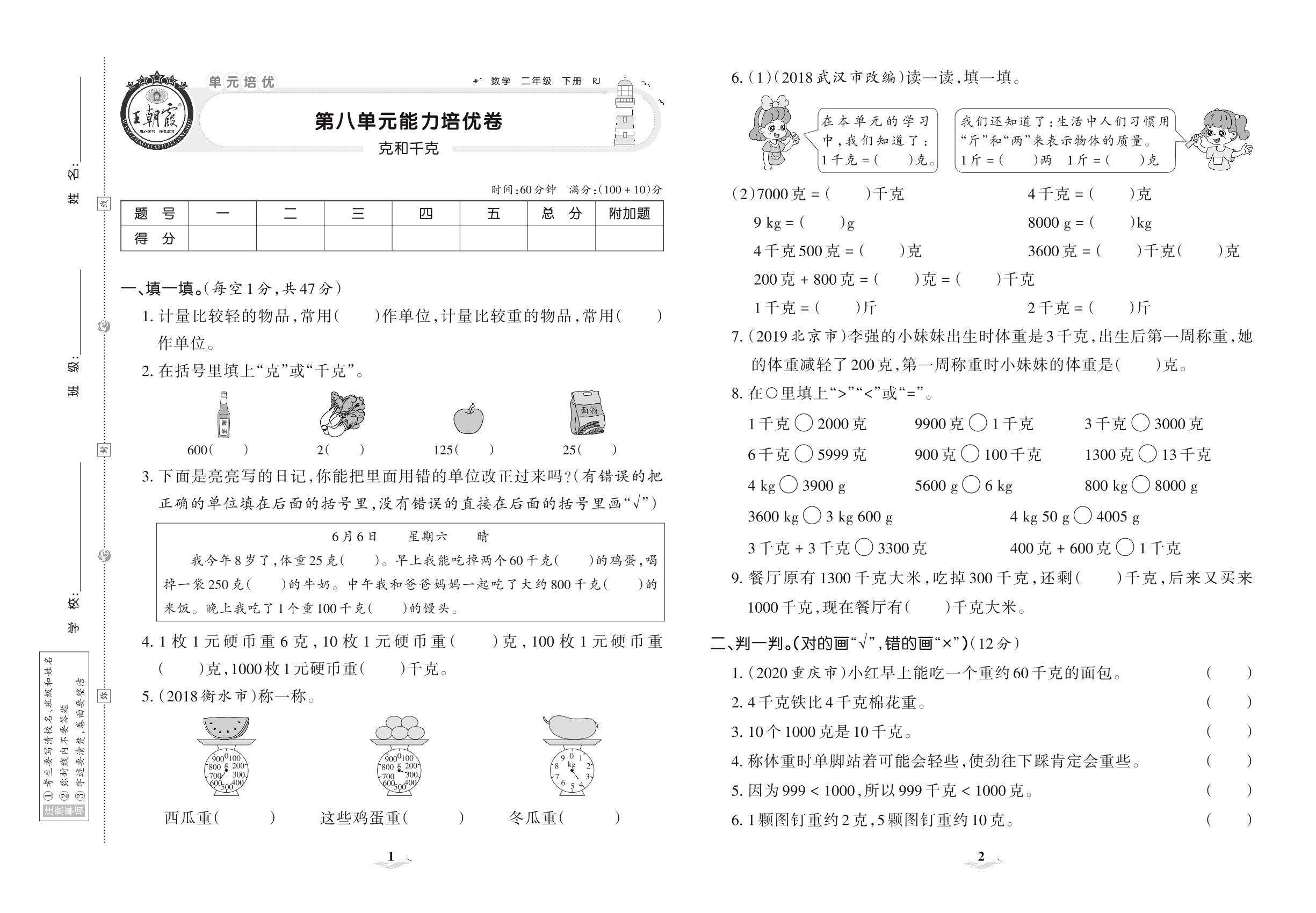 2021下册二年级数学人教版 第八单元 能力培优卷
