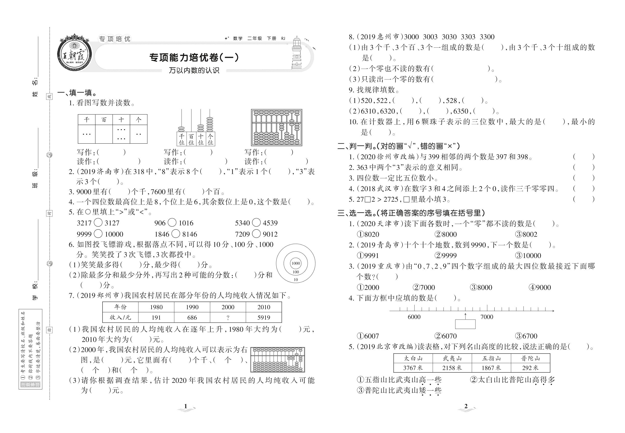 2021下册二年级数学人教版 专项能力培优卷(一) 万以内数的认识