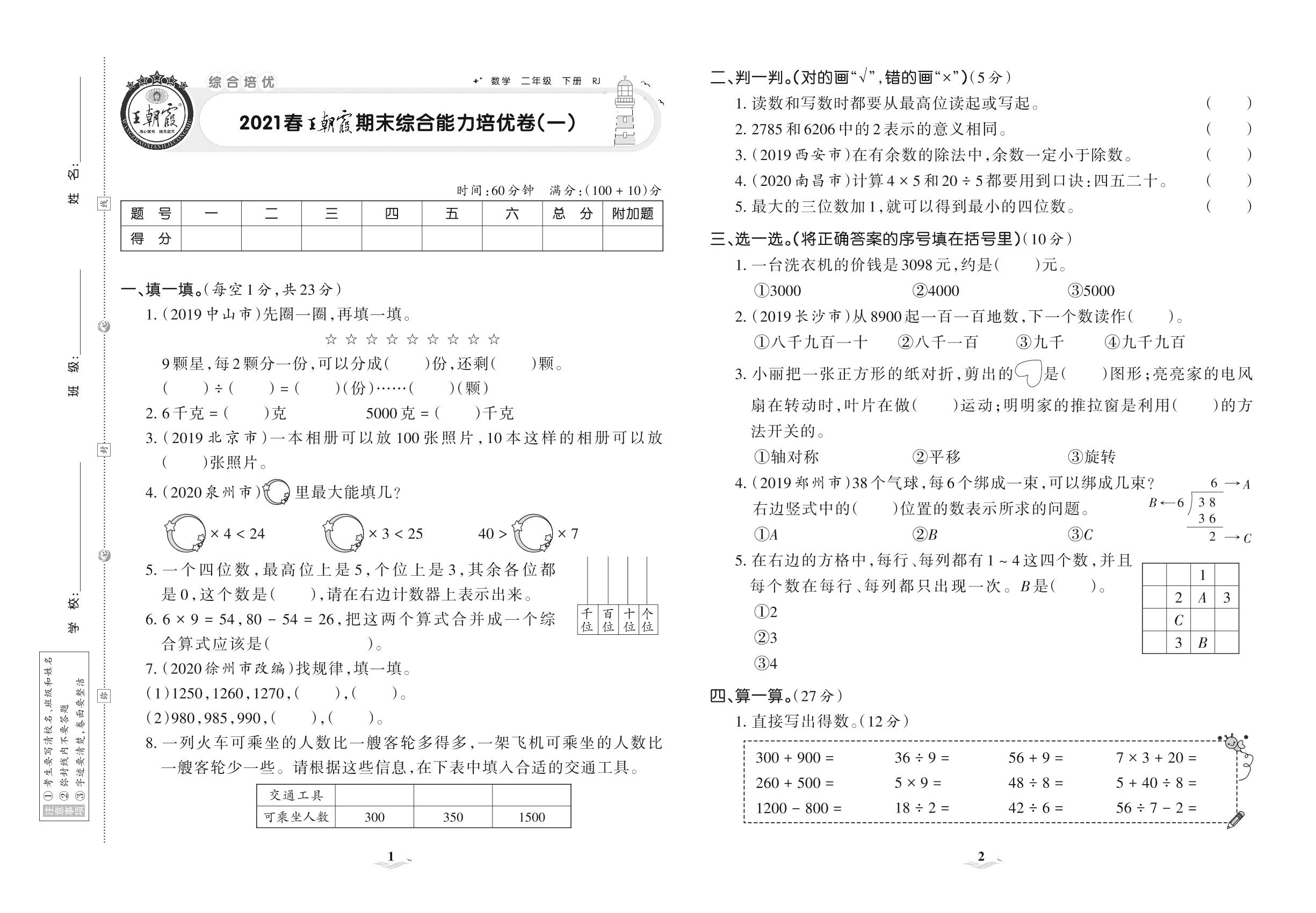 2021下册二年级数学人教版 王朝霞期末综合能力培优卷(一)