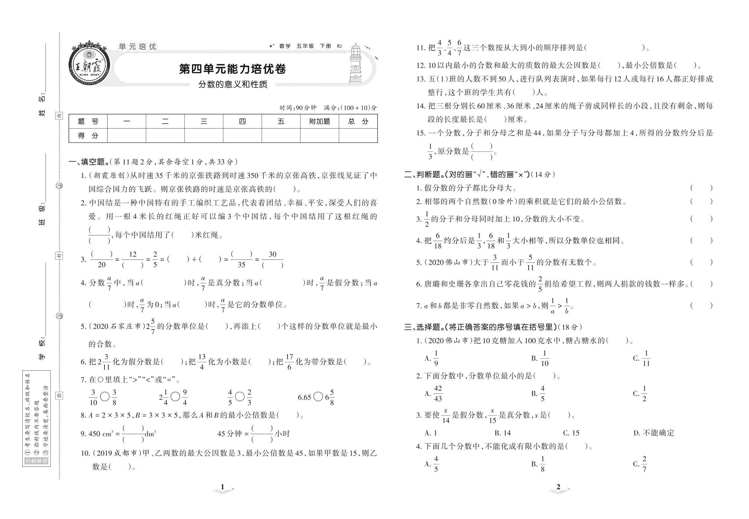 2021下册五年级数学人教版 第四单元 能力培优卷