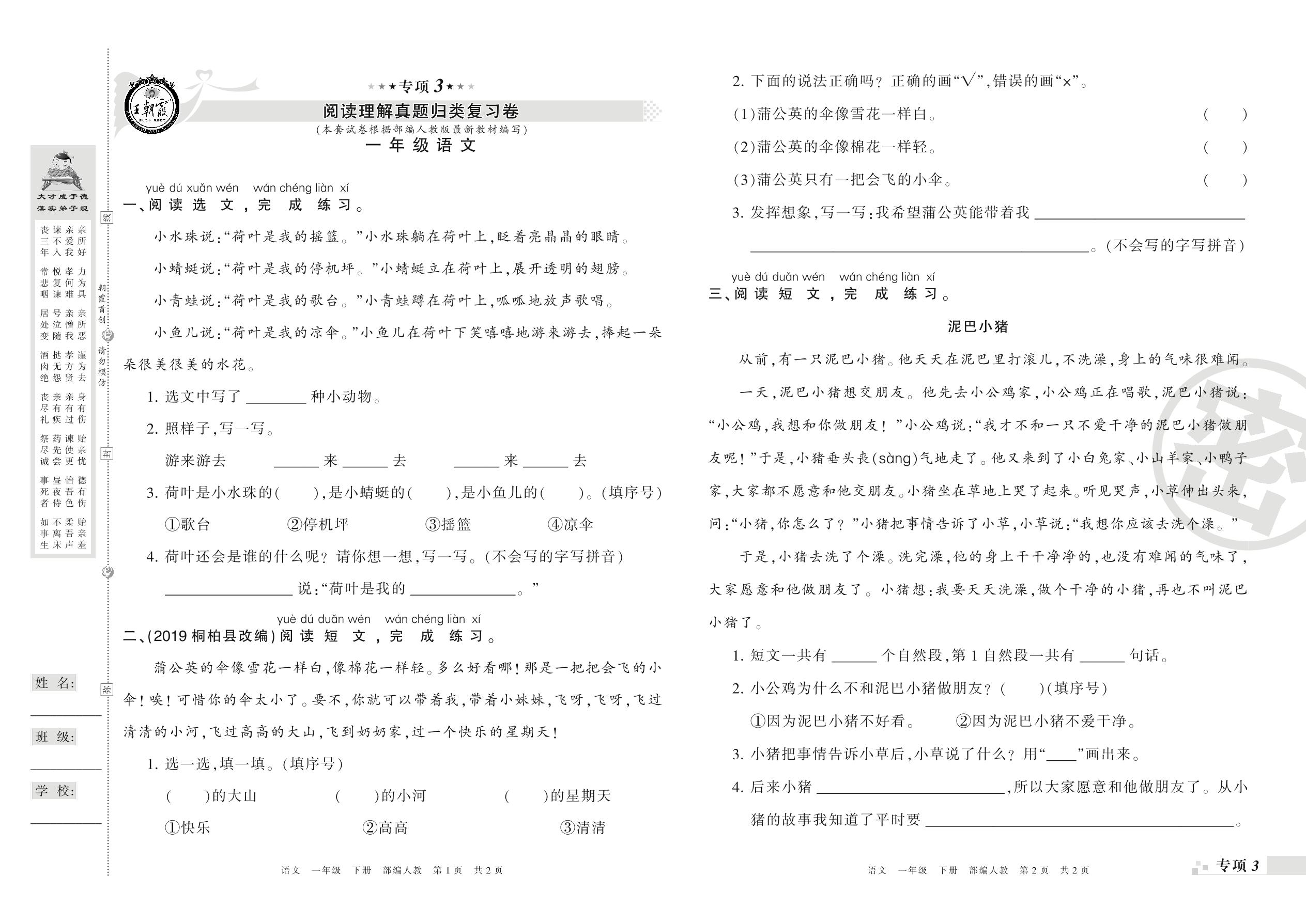 王朝霞期末专项卷——阅读理解、写话真题归类复习卷一年级下册语文(人教版)_R210731180309【0】