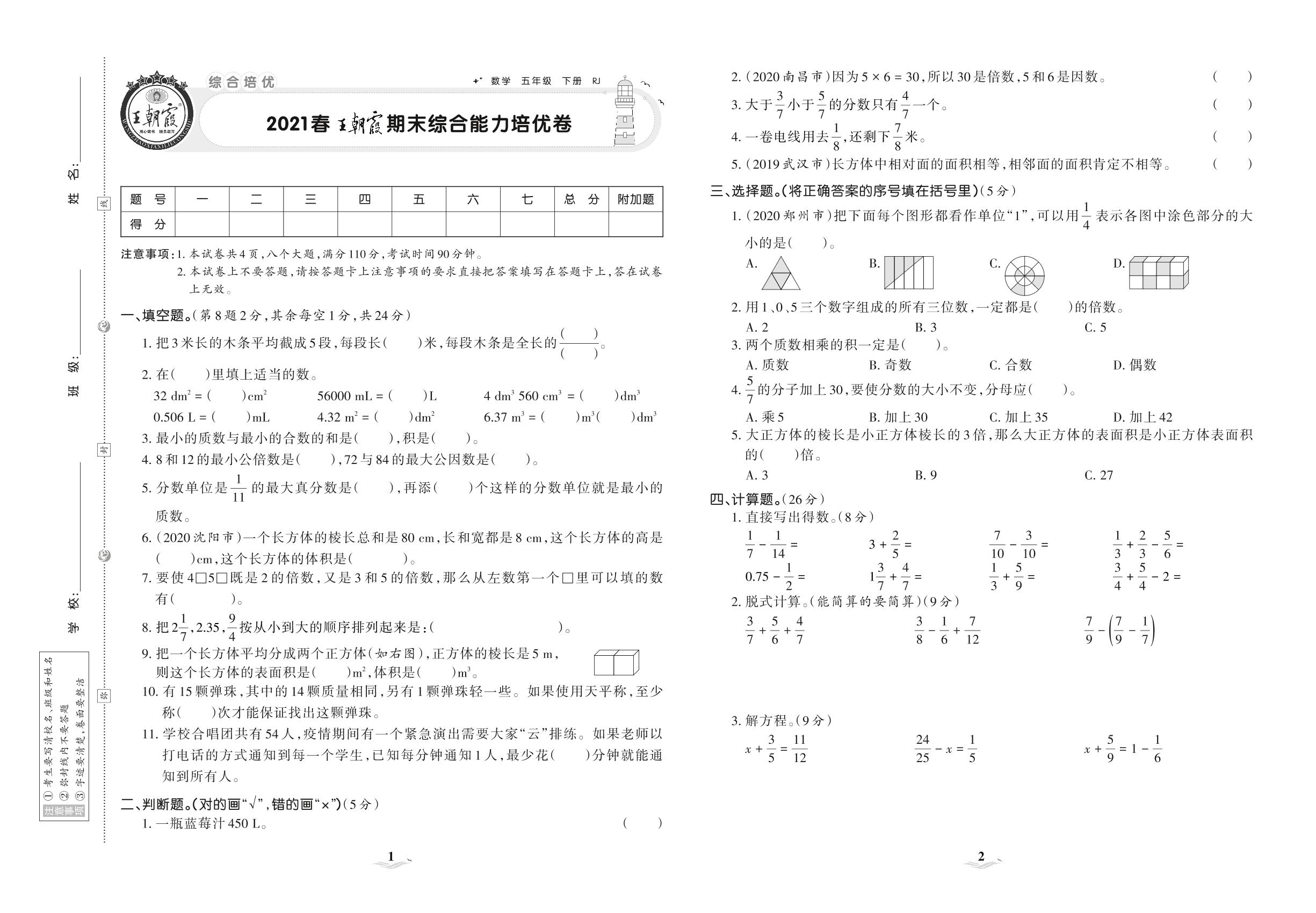 2021下册五年级数学人教版 王朝霞期末综合能力培优卷