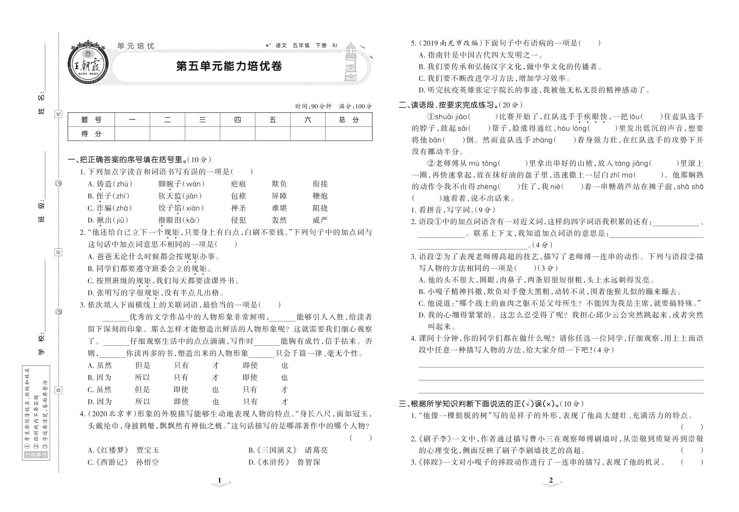 2021下册五年级语文人教版 第五单元 能力培优卷