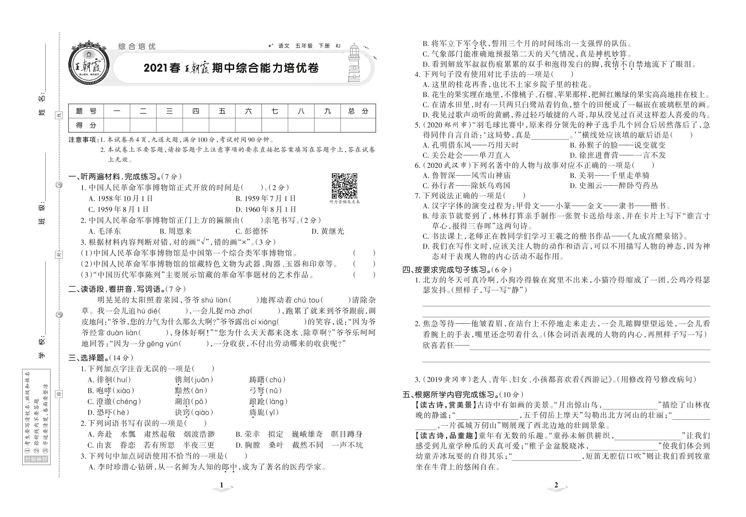 2021下册五年级语文人教版 王朝霞期中综合能力培优卷