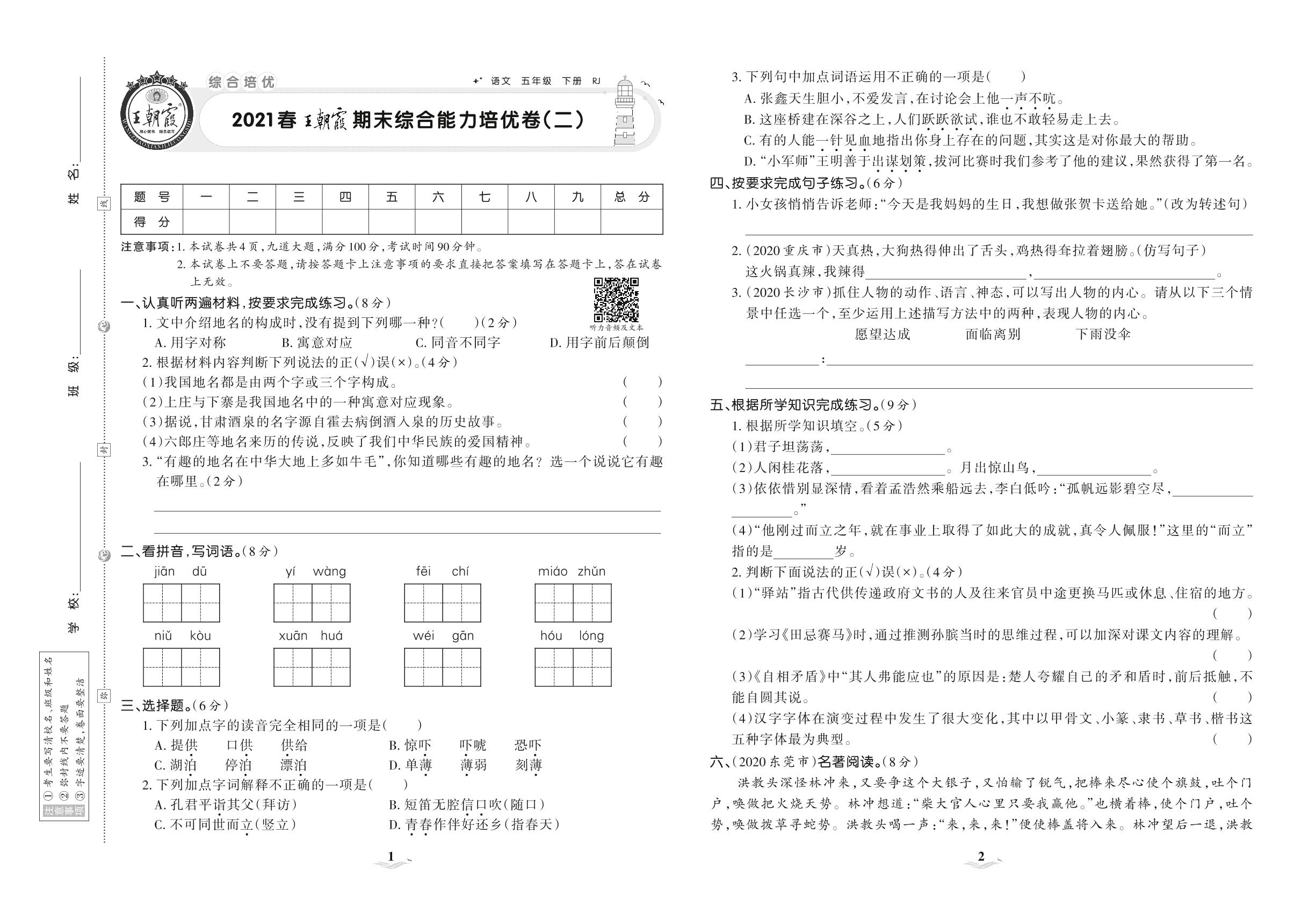 2021下册五年级语文人教版 王朝霞期末综合能力培优卷(二)