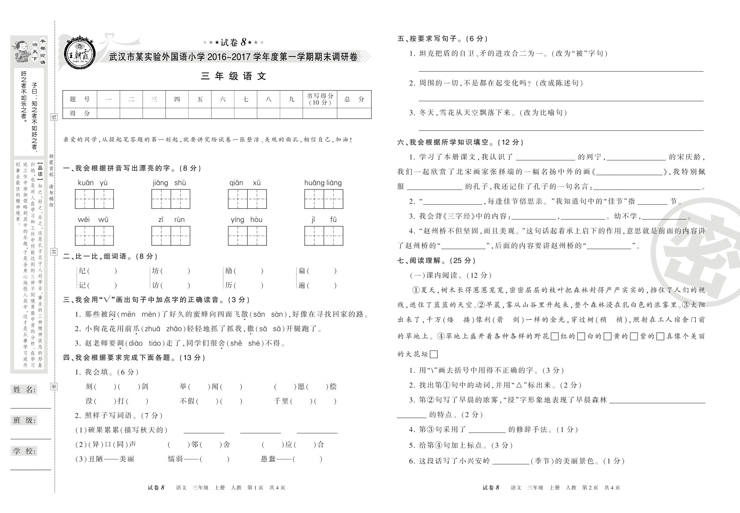 2016-2017学年第一学期武汉市三年级语文试卷(人教版)【8】