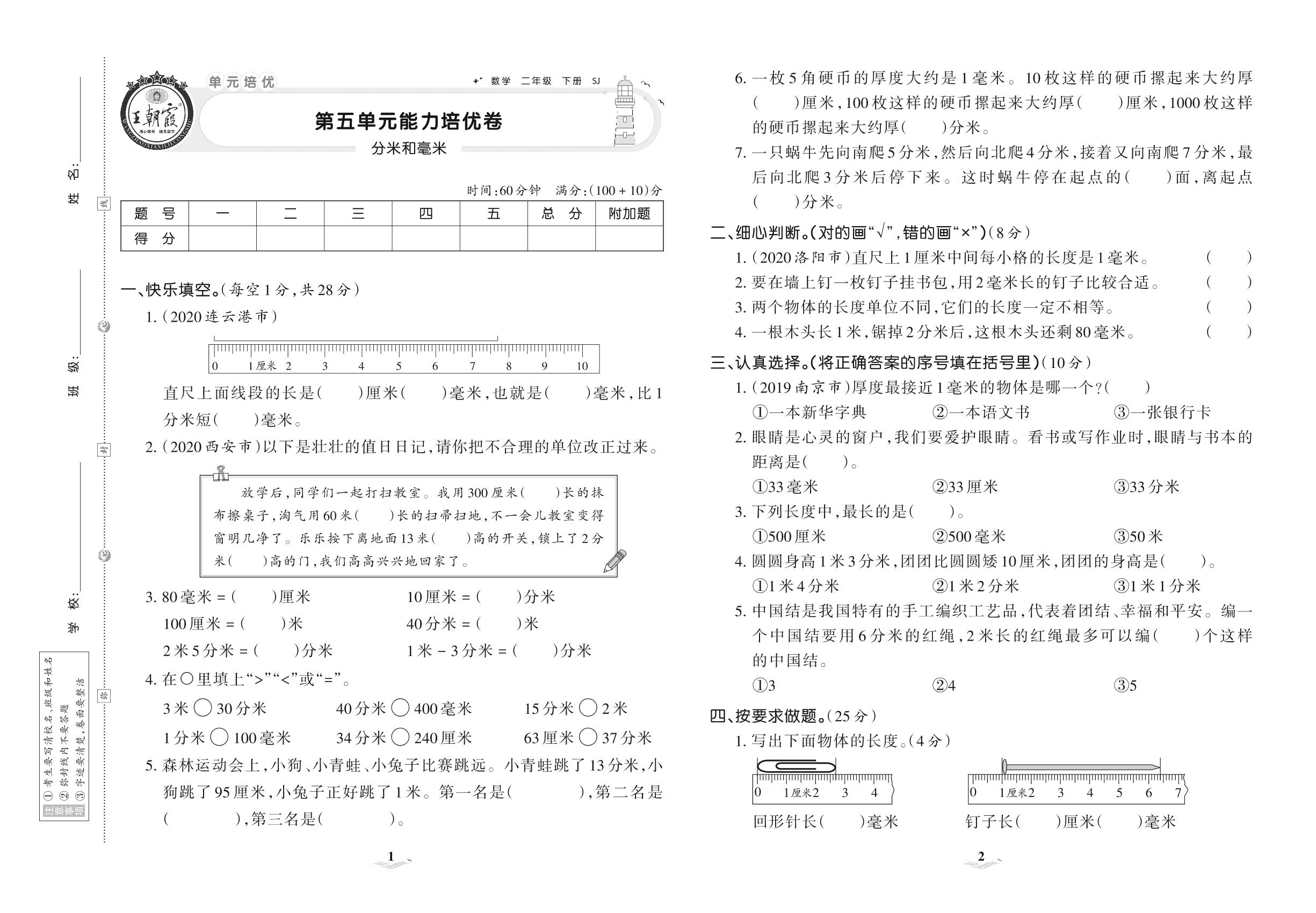 2021下册二年级数学苏教版 第五单元 能力培优卷