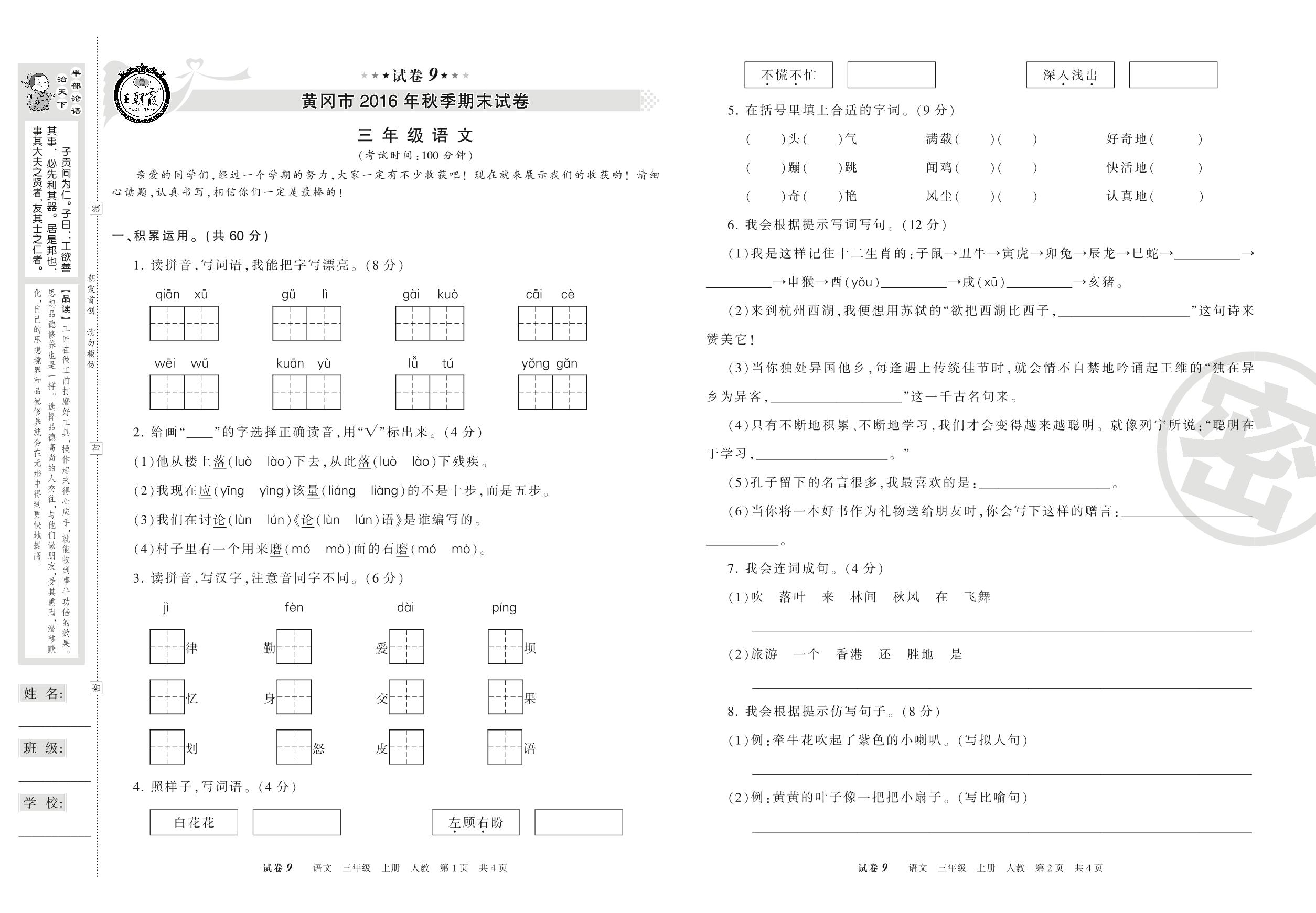 2016-2017学年第一学期黄冈市三年级语文试卷(人教版)【9】