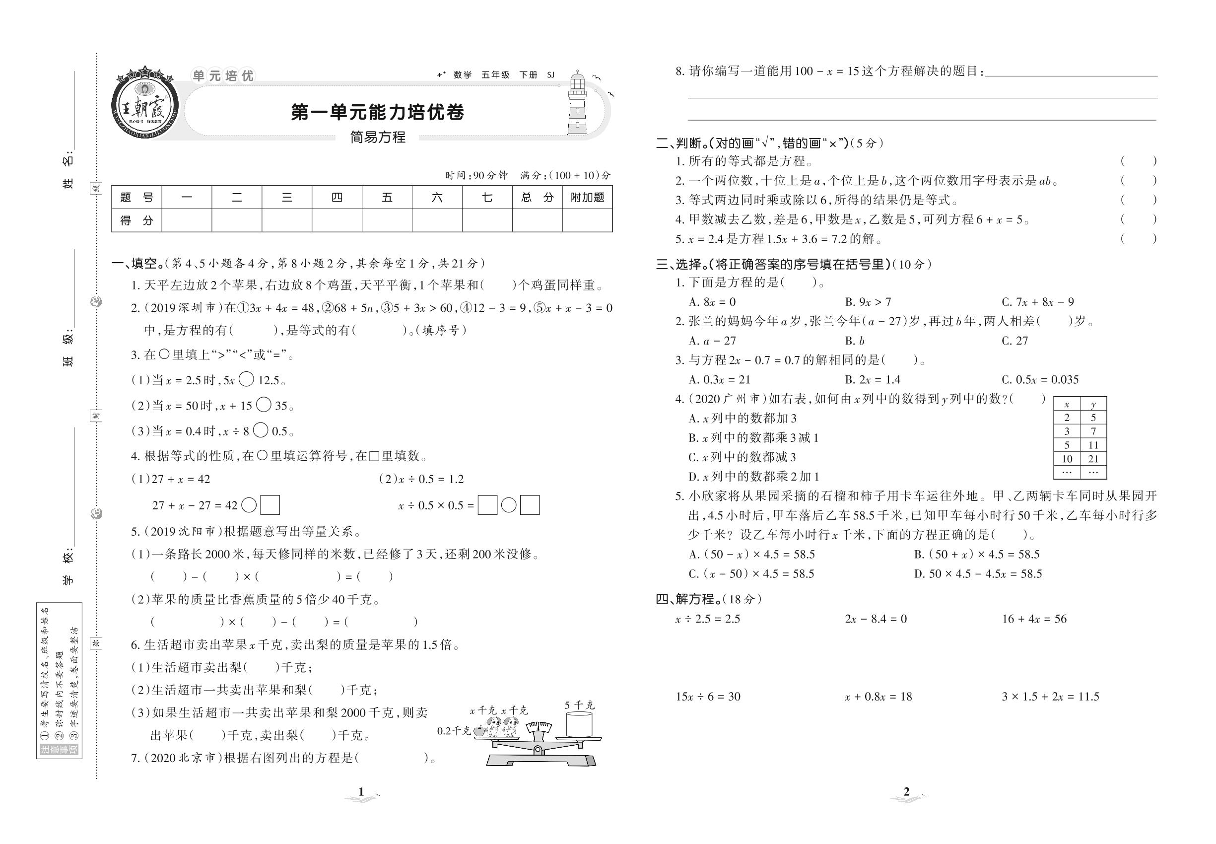 2021下册五年级数学苏教版 第一单元 能力培优卷