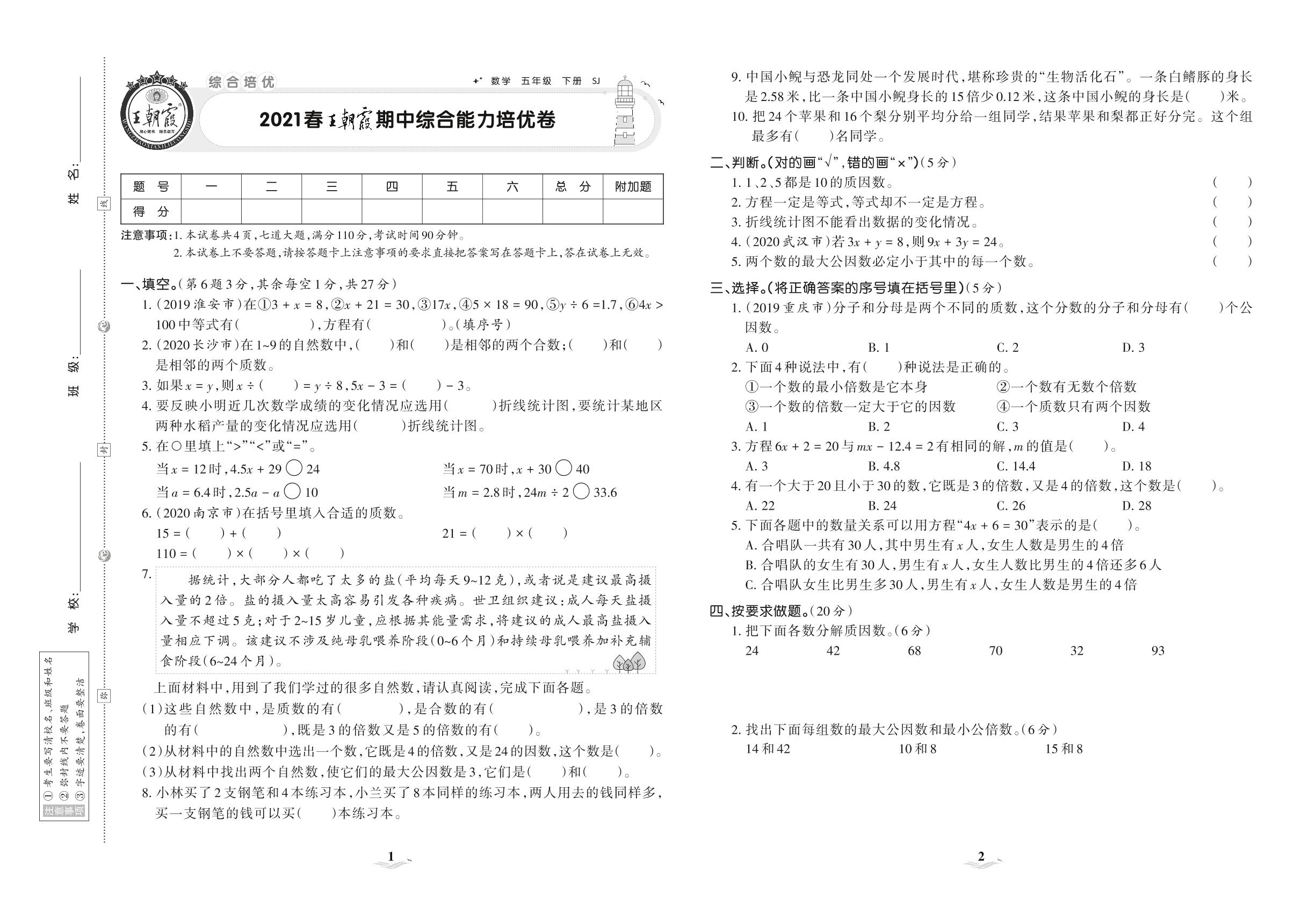 2021下册五年级数学苏教版 王朝霞期中综合能力培优卷