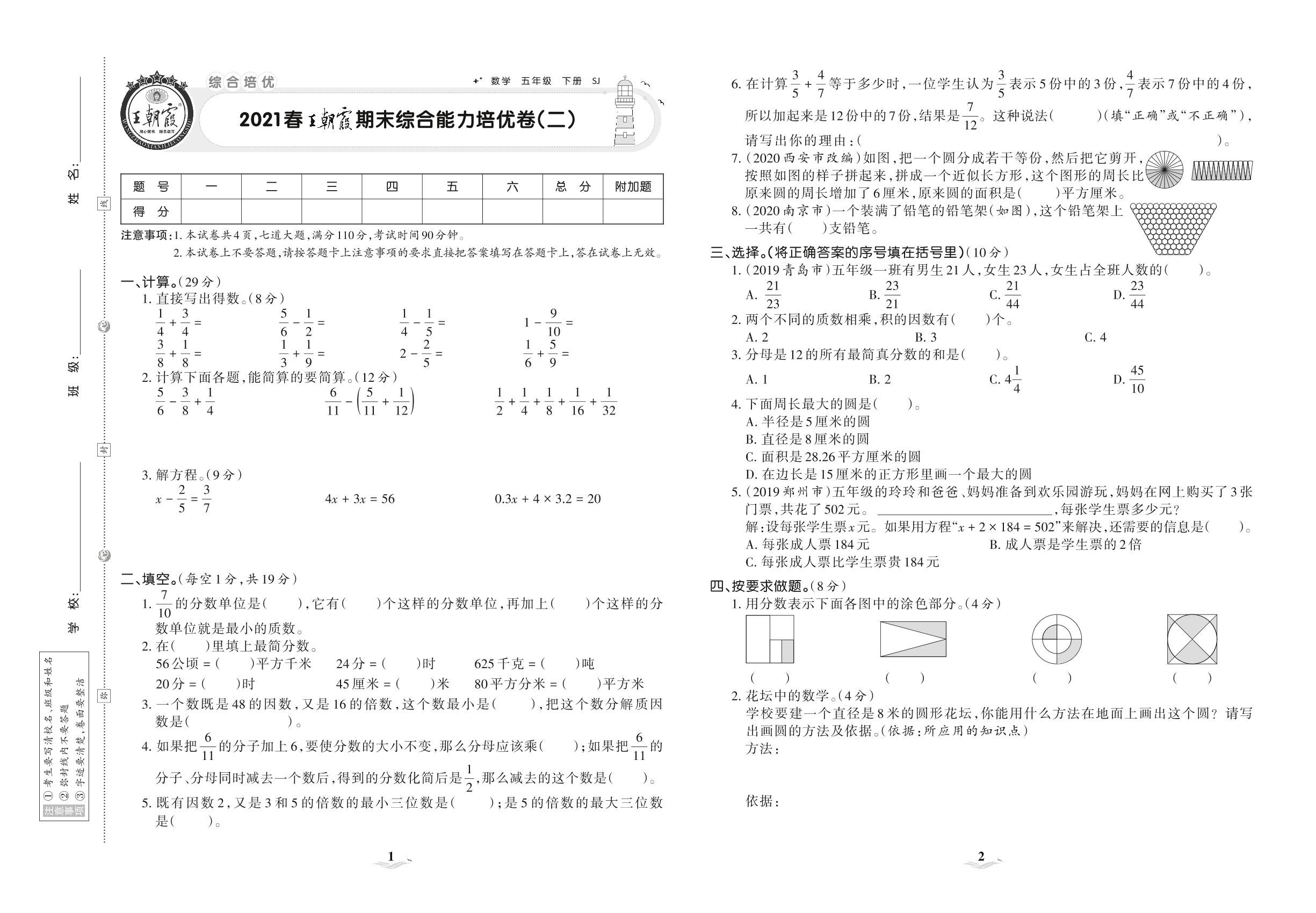 2021下册五年级数学苏教版 王朝霞期末综合能力培优卷(二)