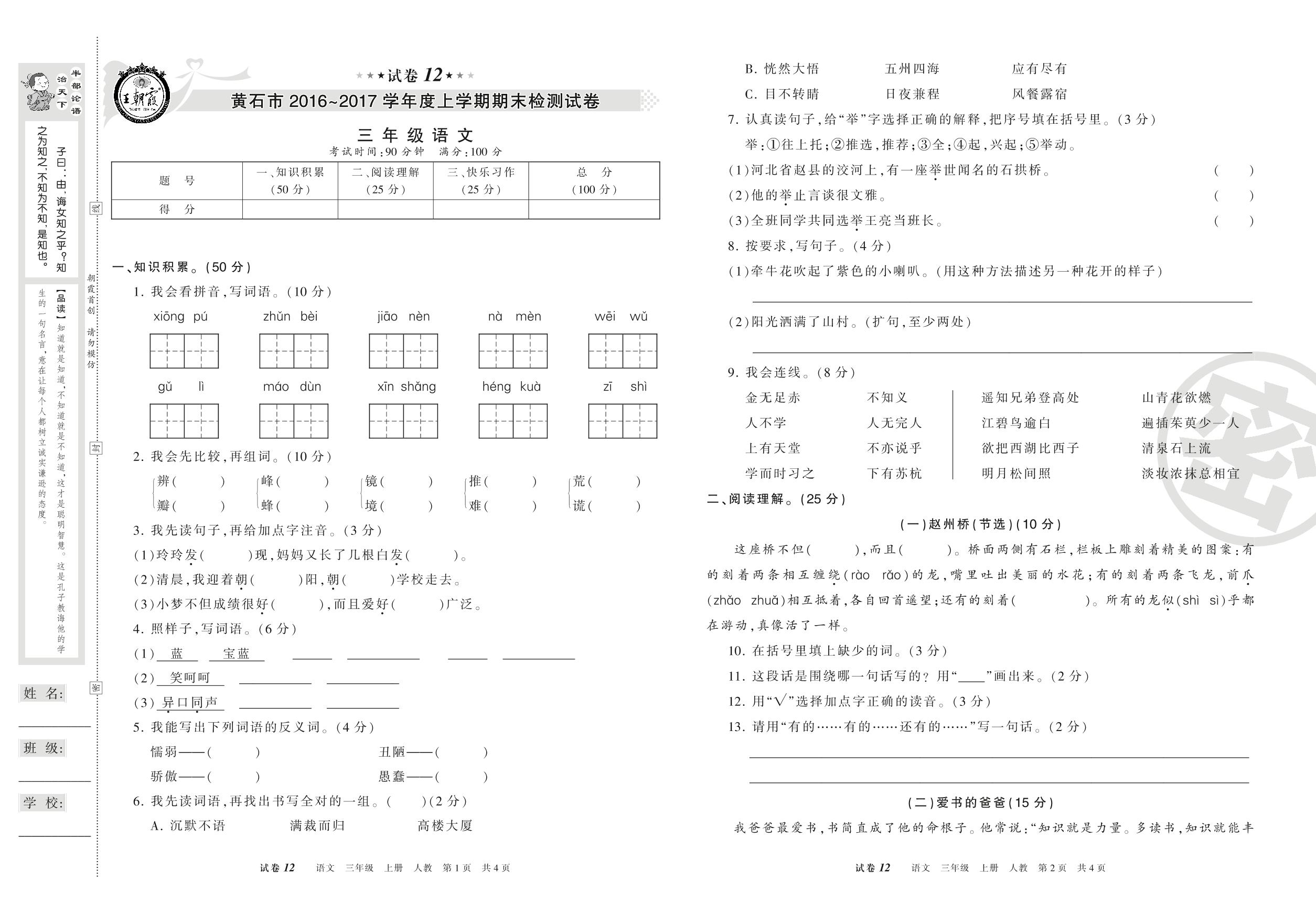 2016-2017学年第一学期黄石市三年级语文试卷(人教版)【12】