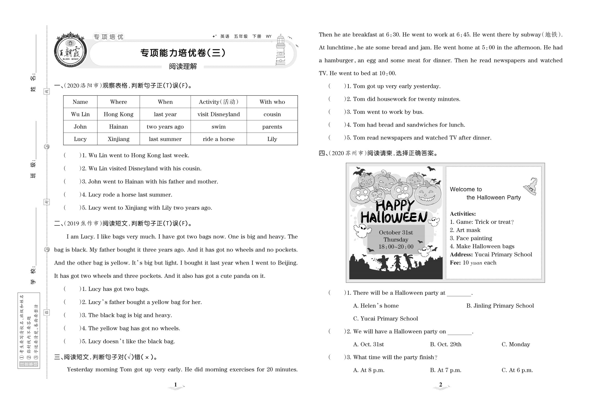 2021下册五年级英语外研版 专项能力培优卷(三) 阅读理解