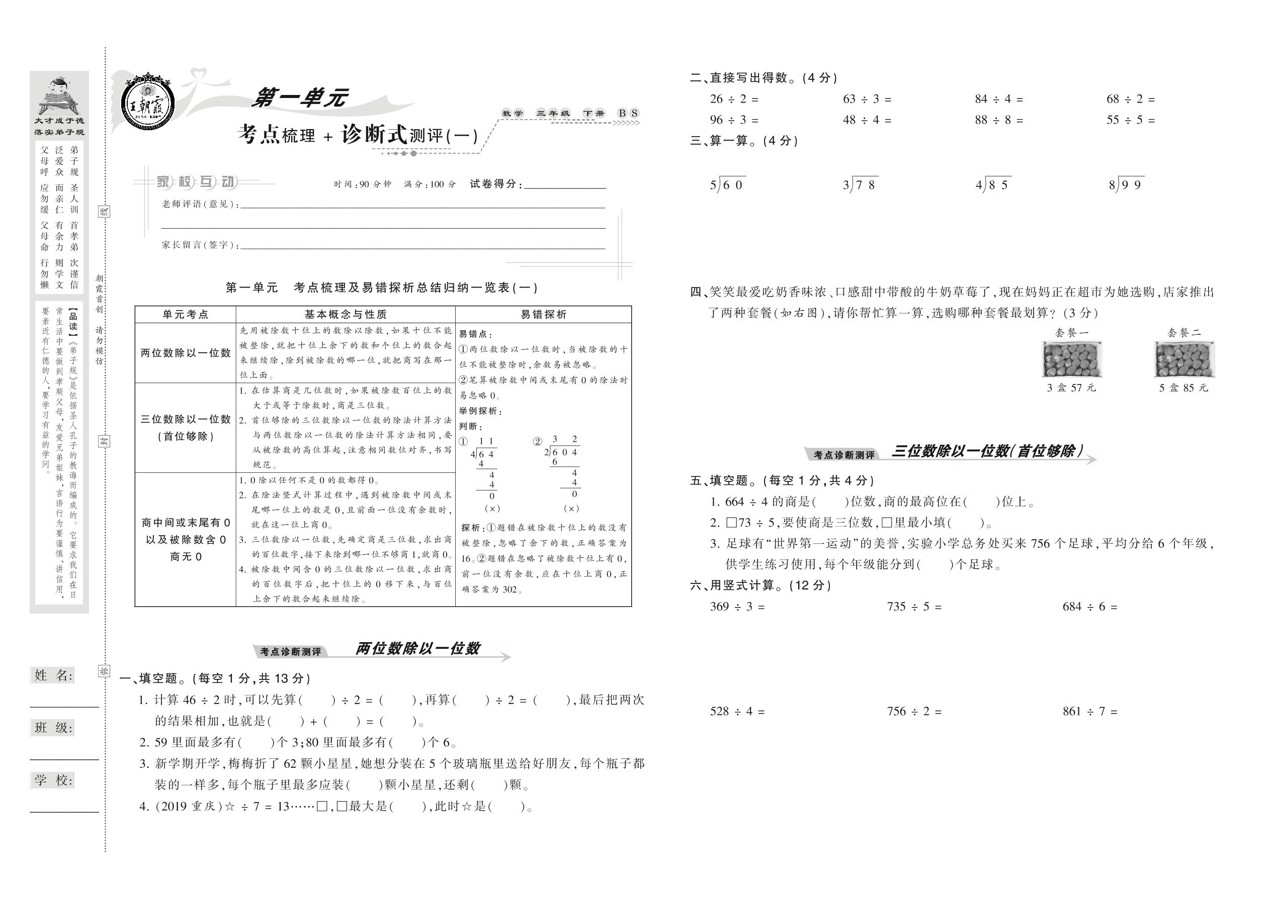 2021下册三年级数学北师版 第一单元 考点梳理+诊断式测评(一)