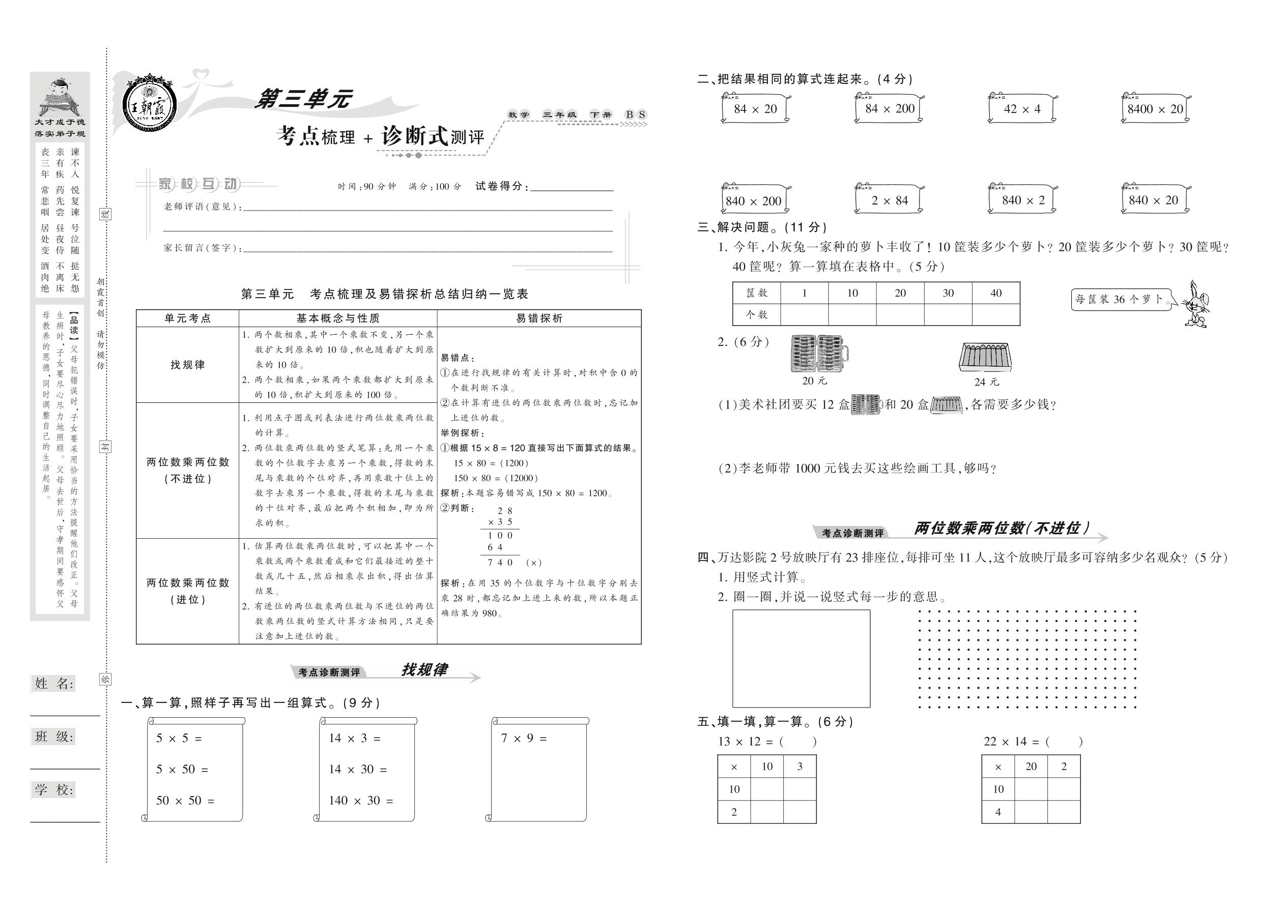2021下册三年级数学北师版 第三单元 考点梳理+诊断式测评