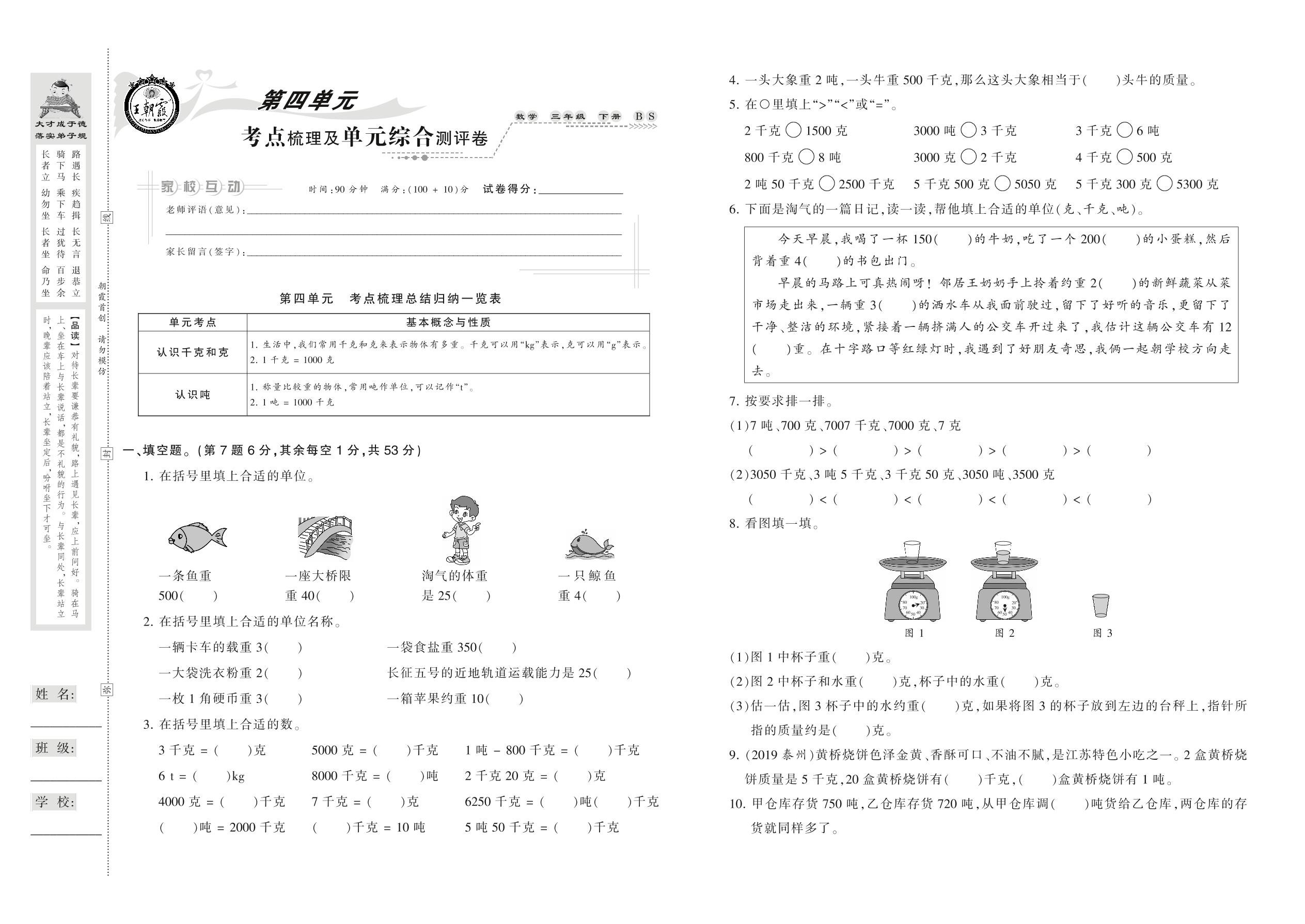 2021下册三年级数学北师版 第四单元 考点梳理及单元综合测评卷