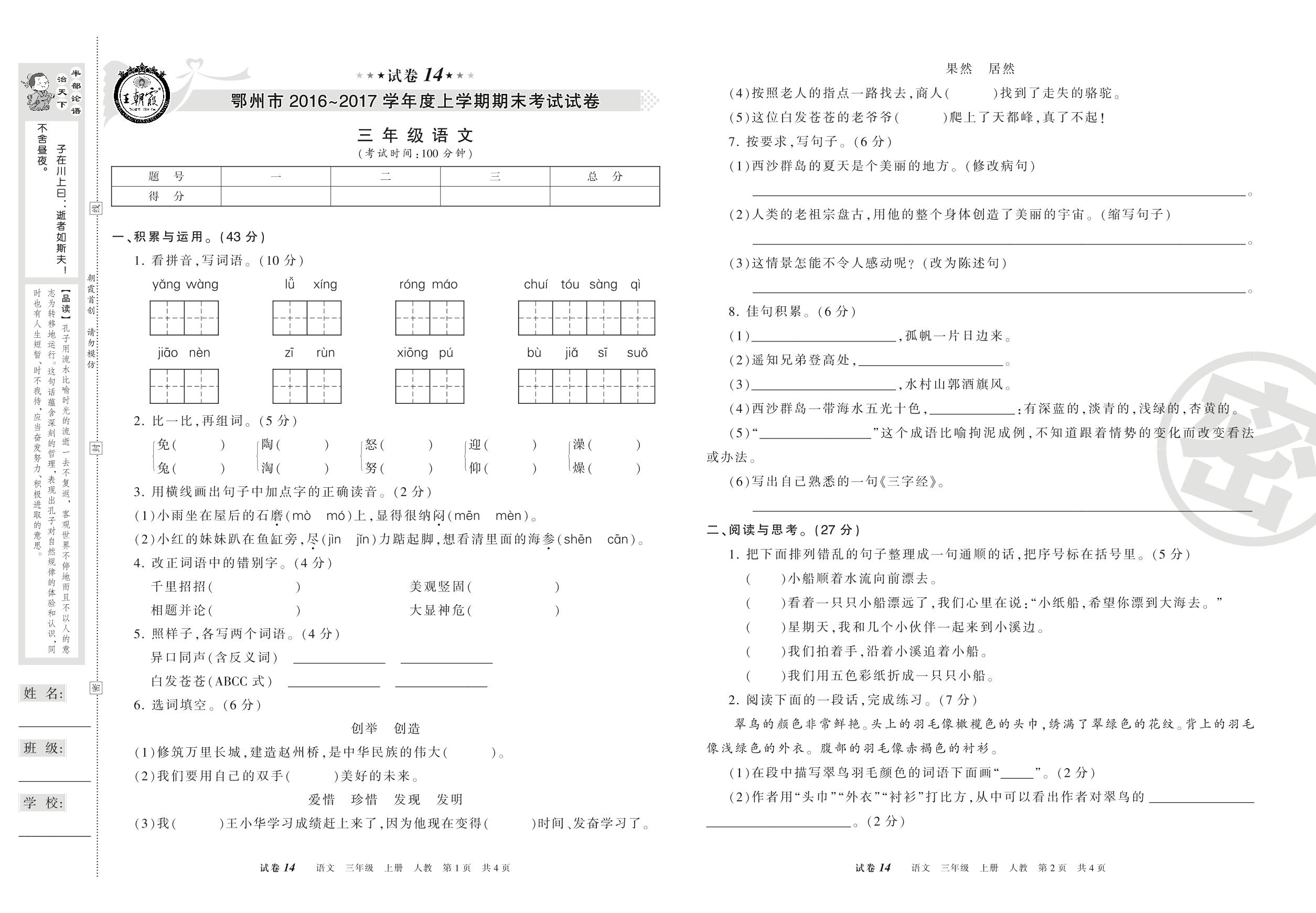 2016-2017学年第一学期鄂州市三年级语文试卷(人教版)【14】